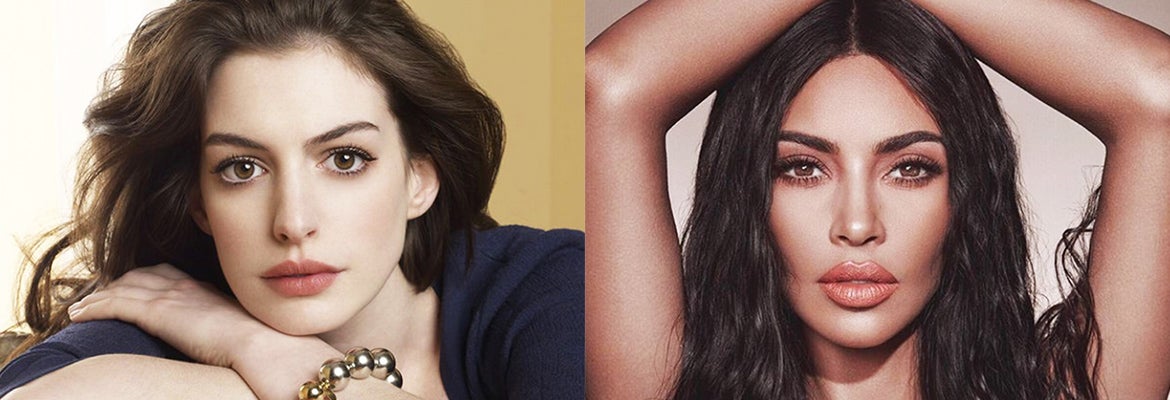 Droopy eyes have the outer corner of the eye sitting lower than the inner corner, like Anne Hathaway does. Kim Kardashian’s eyes are straighter in alignment. Droopy eyes are quite common and the best way to dress them is with lighter toned eyeshadows blended upwards and outwards. When lining the upper eyelid, either end the line where your eye naturally ends or create a winged look where the line moves up towards the eyebrows.