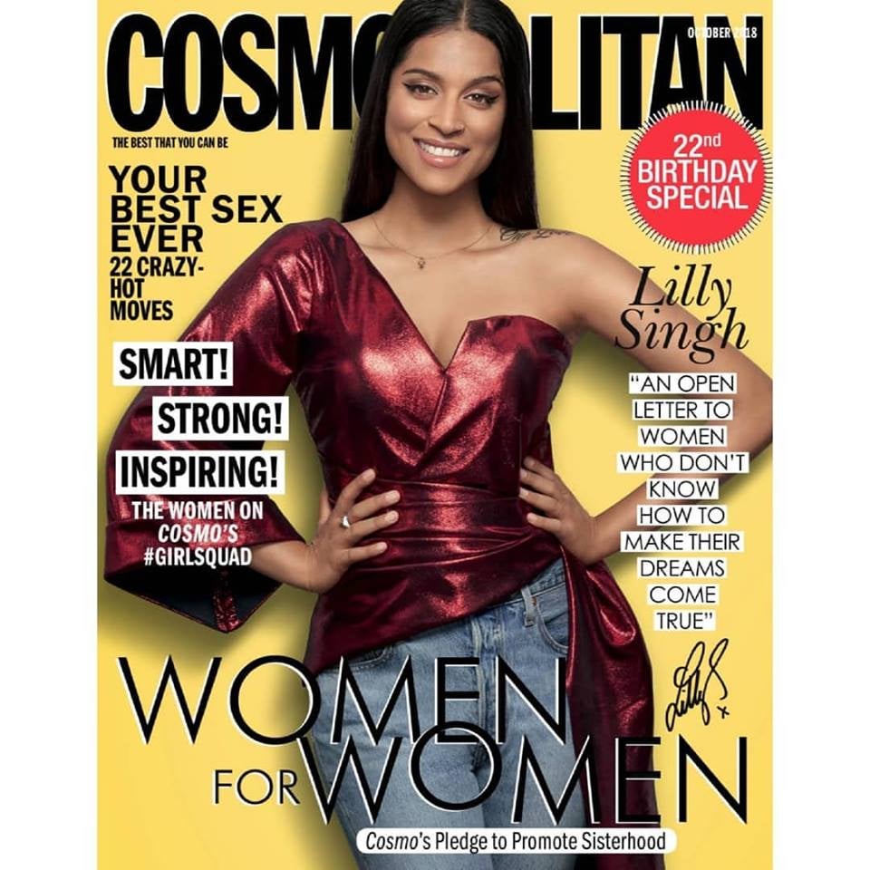 Monisha’s biggest challenge and achievement has been keeping her offering consistently relevant while staying true to her brand ethos. In a way, the Indian fashion industry’s evolution has mirrored her own and being involved in the process as an insider has provided constant food for thought for the designer. “Besides modern architecture, art, music and travel, India has been my biggest source of inspiration.” This global Indian outlook has seeped into her personal style as well. It’s one she defines as “a constant dance between contemporary flair and traditional elegance,” going on to explain, “I am always experimenting with colours, silhouettes, textures and styles for work, which is invariably absorbed into my personal style too.” In pic: Lilly Singh aka Superwoman on the cover of Cosmo India, October 2018 in a top by Monisha Jaising .