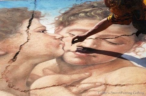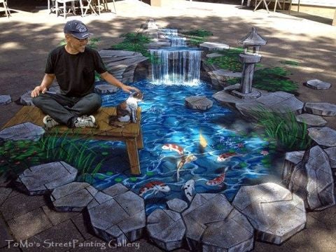 Like most artists Tomu finds inspiration all around but mostly from old paintings, contemporary photography, travel and films. “I love the work of many artists, but if I have to choose one it would have to be French painter William-Adolphe Bouguereau. His works are just beautiful, heavenly, gorgeous…” He favours working with quick-drying mediums like chalk, pastels, and pigments. Interestingly, even when he’s in the middle of working on a picture it always looks somewhat complete. “It’s a kind of street performance. I enjoy making something that nobody can purchase. My art is not for art critics, it’s for the public.” Tomo participates in street painting festivals across Europe, the US, Mexico, the UAE, Hong Kong and Japan. Among his many achievements, the one he’s most proud of is winning first place twice at the International Street Painting Festival in Grazie di Curtatone, Italy. “It is considered as Madonnaro's most traditional and prestigious prize and it’s special to be chosen among the Maestri Madonnari,” he says. Tomo has worked on a number of ambitious projects: In a Guinness World Records attempt to create the largest anamorphic aka three-dimensional pavement art in 2014, he joined forces with street artists from all over the world at Venice, Florida. He also single-handedly finished seven 3D paintings in front of QVC Japan’s new building in 2013, a project that posed challenges in terms of material (the commissioning team wanted the artworks to stay intact for six months), the weather, and the time frame. The artist is excited about the possibility of an eventual homecoming in the future—“I’d love to organize a street art event on a large scale in Japan.” All photographs are courtesy Tomoteru Saito's webpage (http://tomoteru.web.fc2.com/index.html)