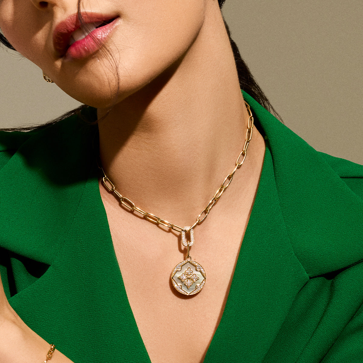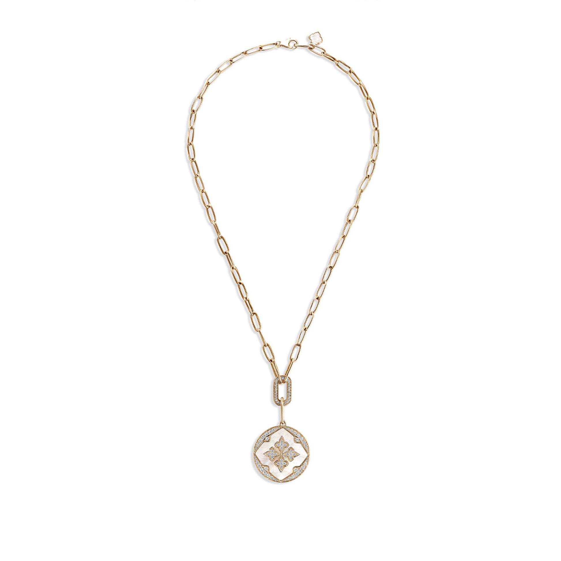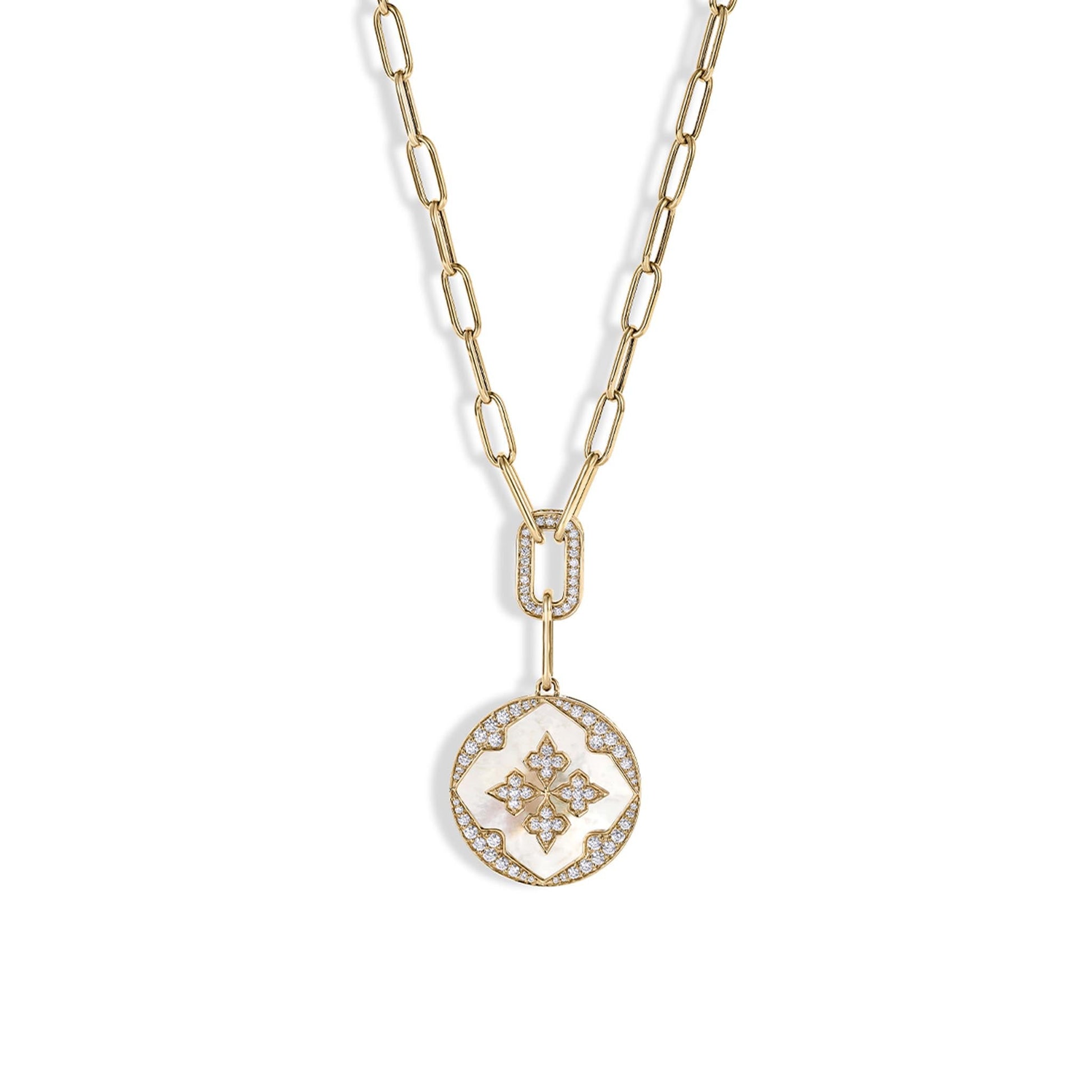 Light as a breeze yet deeply grounding, the Air’s Embrace Medallion is inspired by the softness of Mother of Pearl and the freedom of air. Designed in 18K gold with natural diamonds, it floats close to the heart—whispering grace, clarity, and effortless elegance.
