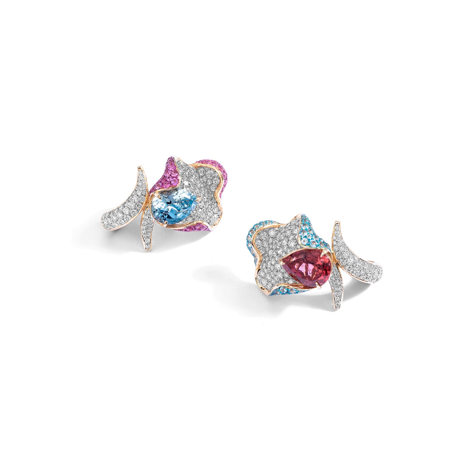 The Aurora Nectar Earrings embody the enchanting moment where night turns to day — a symbol of transformation and renewal. Crafted in 18KT gold, they feature asymmetric wings adorned with vivid rubellites, serene blue topaz, and delicate ruby accents that mirror a butterfly in graceful metamorphosis. Radiant and poetic, these earrings celebrate duality and inner strength — designed for the woman who embraces change with elegance and shines with the light of endless beginnings.
