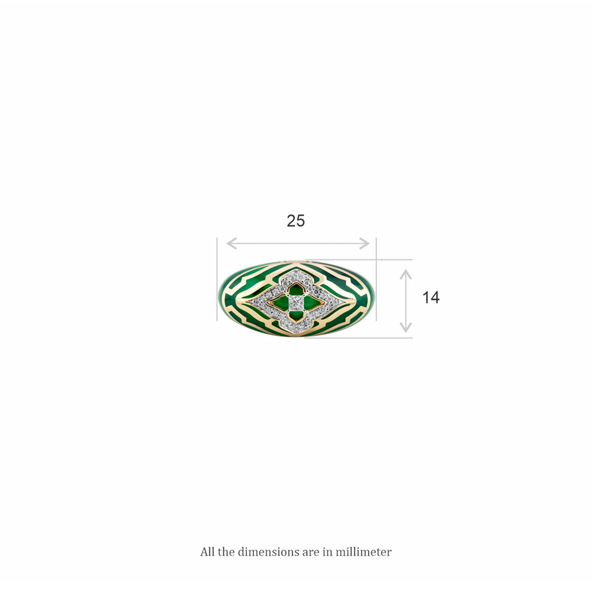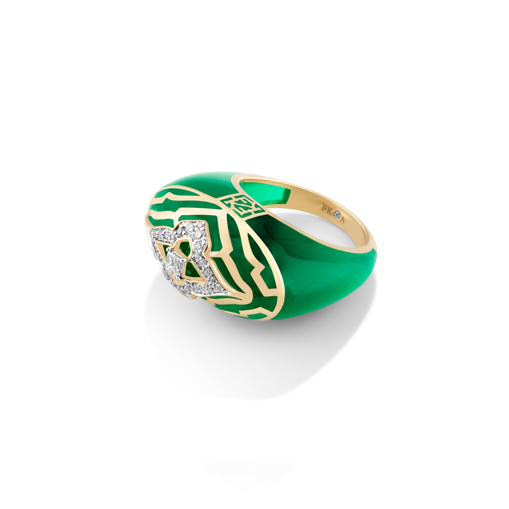 The Bali Vivacious ring elegantly captures the emerald hues of Bali's tropical forests and coastal landscapes. Crafted in 18kt gold, natural diamonds and ceramic this ring is for the fearless traveller for the cheerful who travels to experience new opportunities along her way.