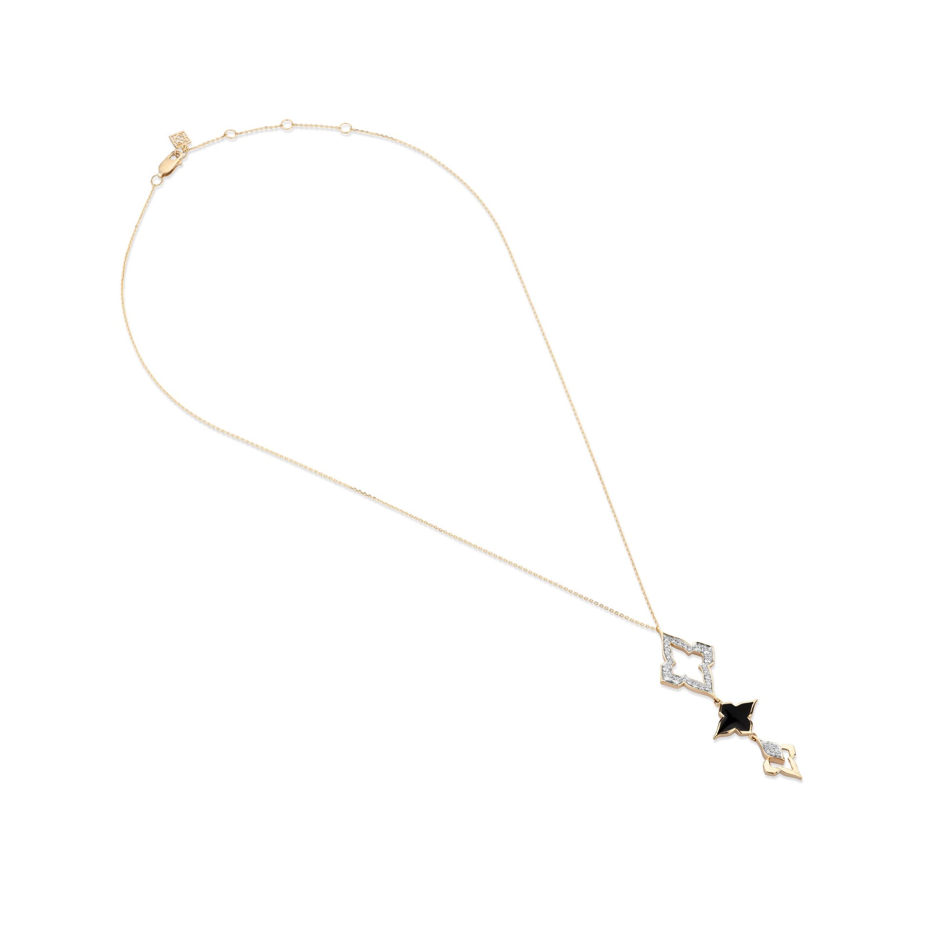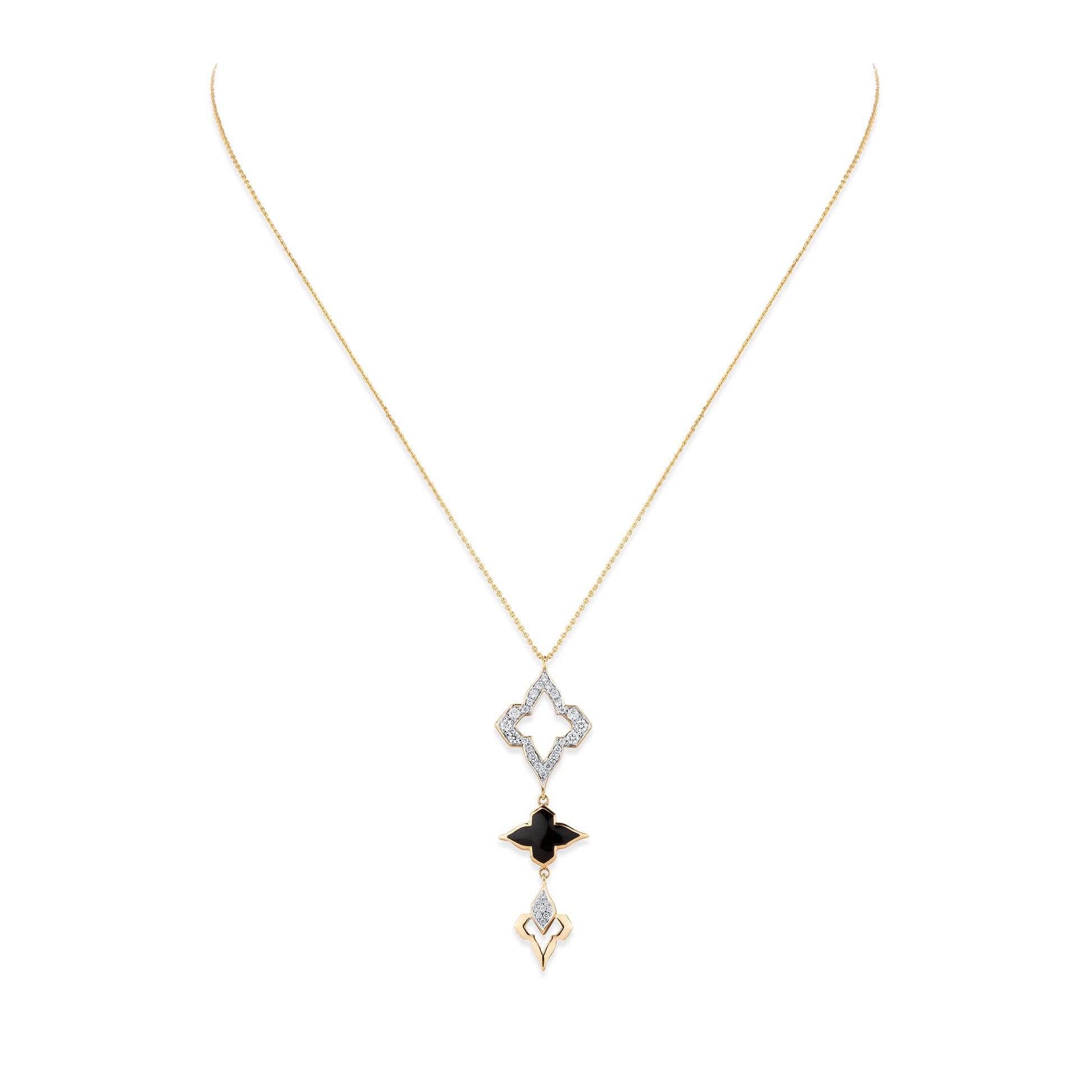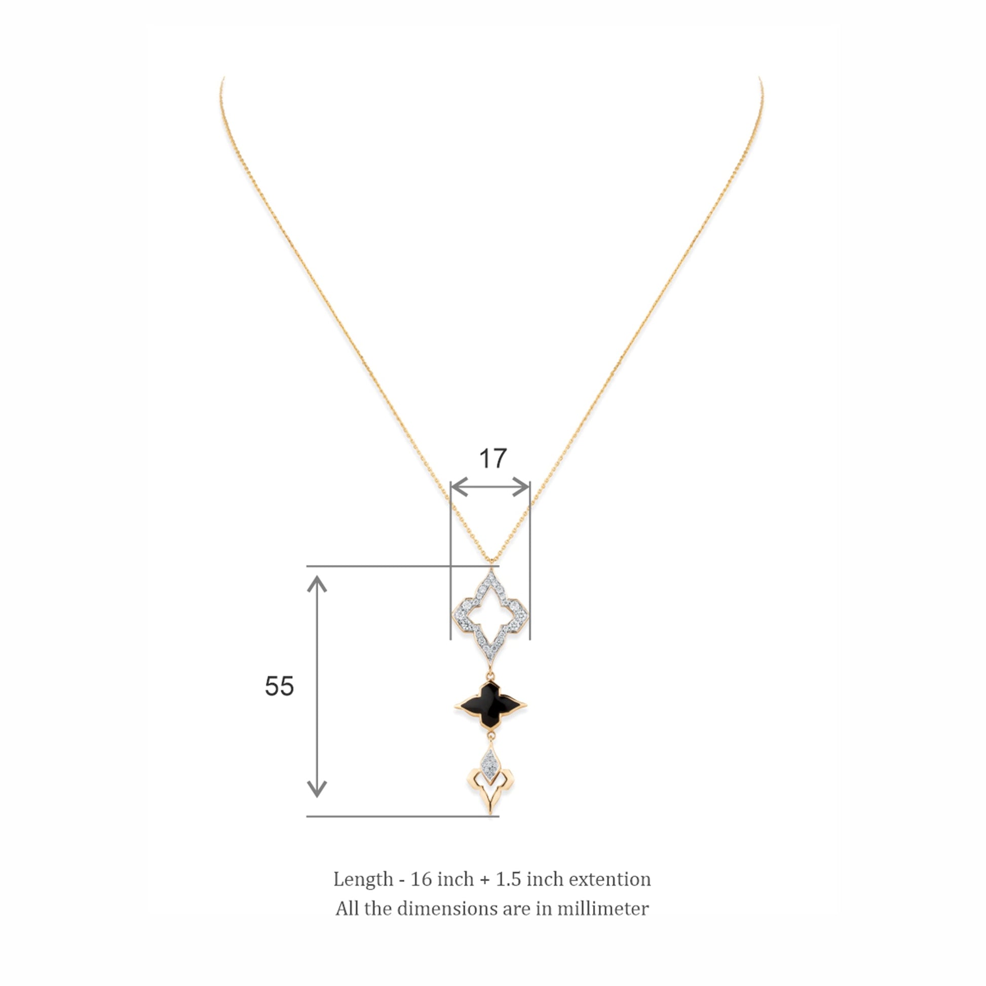 Designed in 18kt gold, brilliant diamonds and black ceramic, this classic Aayat necklace is for the woman who is unapologetic and will triumph against all the odds. The Chain Length 18 inches with adjustable links at 17inch and 16inch at the back.