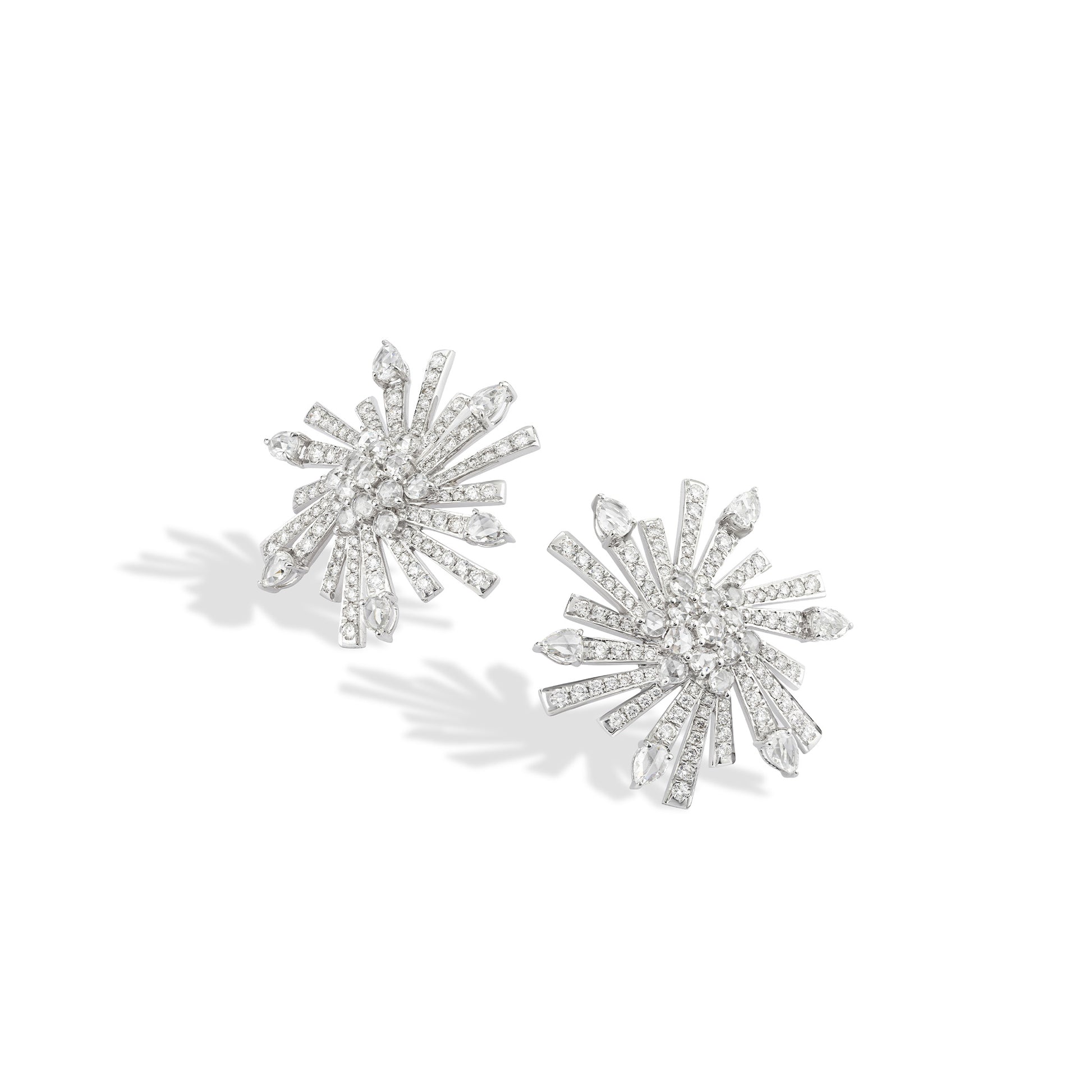 The Cosmic Dazzle Earrings capture the radiant intensity of celestial light in a bold yet graceful form. Pear-shaped and round natural diamonds burst outward in star-like rays, converging at a brilliant core inspired by a cosmic explosion. Crafted in 18KT gold, the design reflects celestial energy with refined elegance.