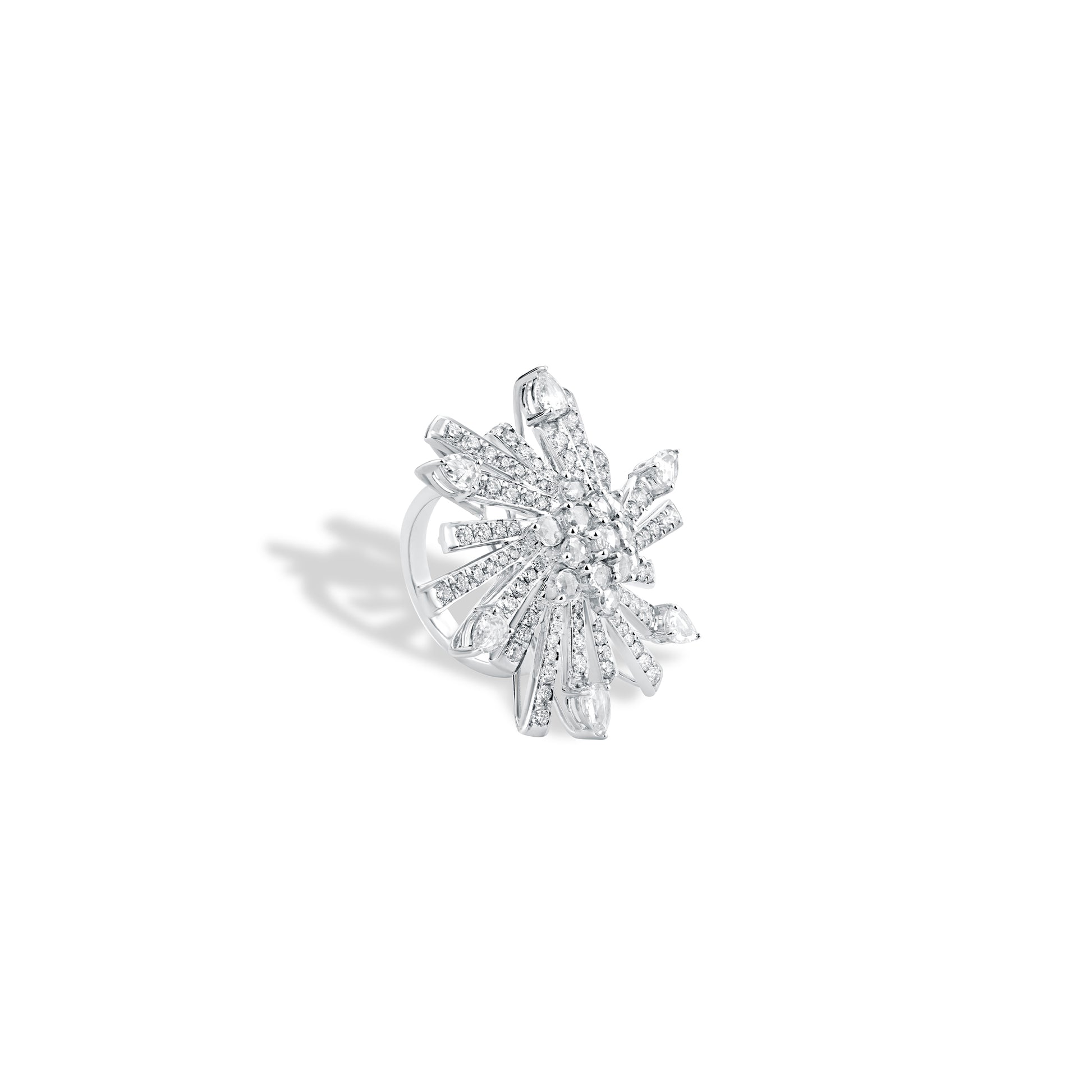 The Cosmic Dazzle Ring draws inspiration from the radiant burst of a celestial supernova, captured in a bold yet elegant silhouette. Pear-shaped and round natural diamonds flare outward in shimmering rays, all anchored by a luminous central core that mirrors the heart of a star. Crafted in 18KT gold, it reflects cosmic energy with refined brilliance.