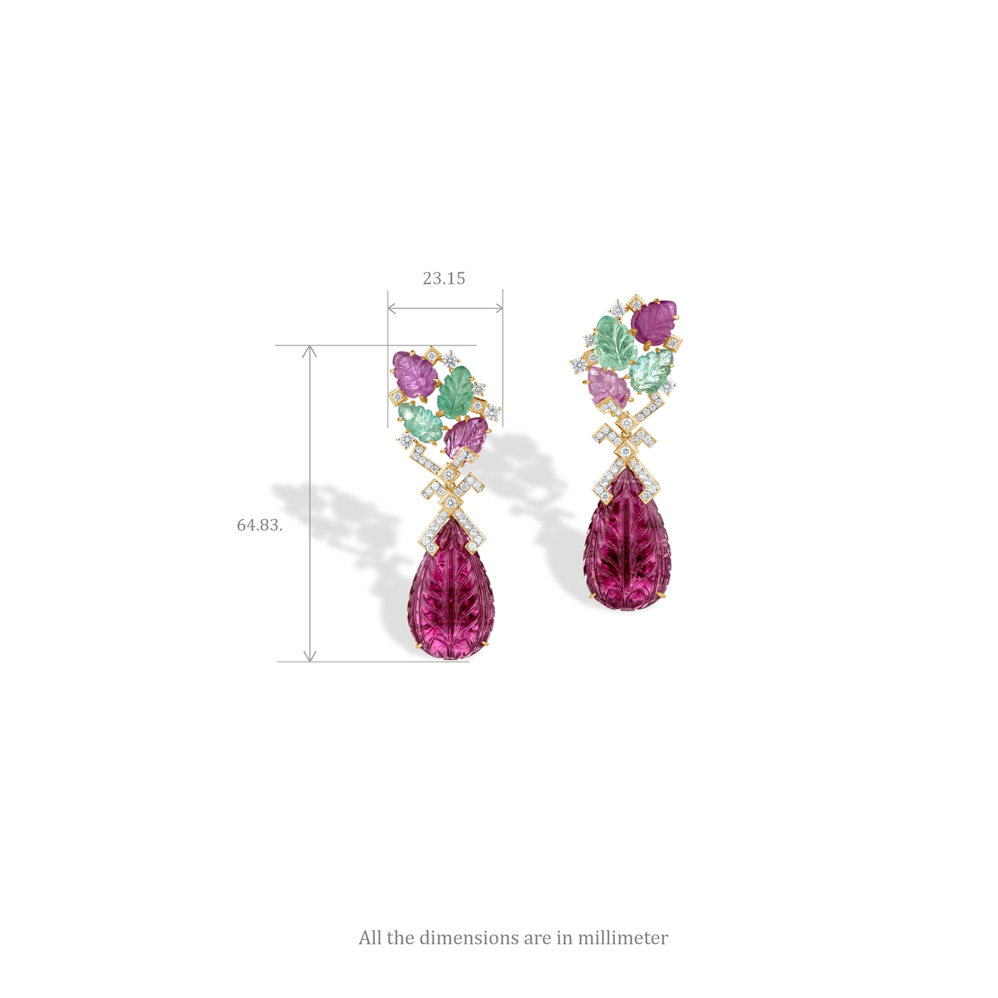 The Crimson Élan Earrings capture the splendour of royal gardens in full bloom. Crafted in 18KT gold, they feature hand-carved rubies, emeralds, and rose quartz shaped into delicate petals and leaves, accented with sparkling natural diamonds that glisten like dew. A richly carved ruby drop completes the design, radiating elegance and timeless allure — a true harmony of craftsmanship and nature’s poetry.