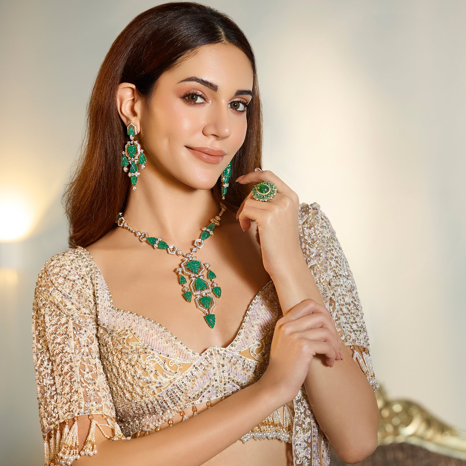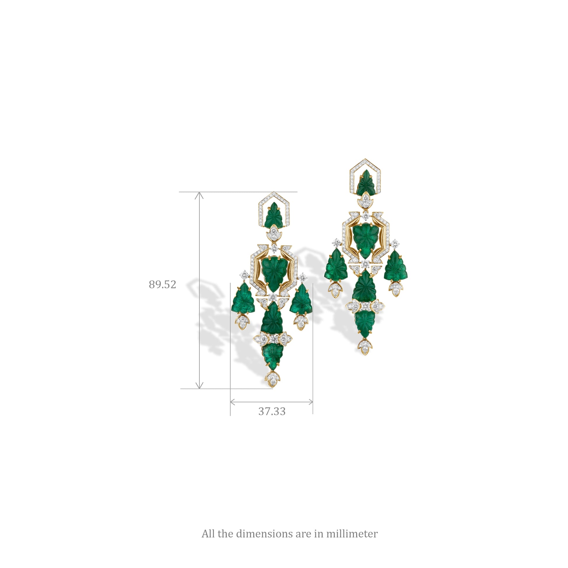 The Emerald Canopy Earrings evoke the serene beauty of sunlight-dappled palace gardens. Crafted in 18KT gold, they feature carved emerald leaves paired with sparkling natural diamonds, framed in regal hexagons for a perfect balance of nature and geometry. Elegant and timeless, these earrings capture the grace and tranquility of a royal courtyard in full bloom.