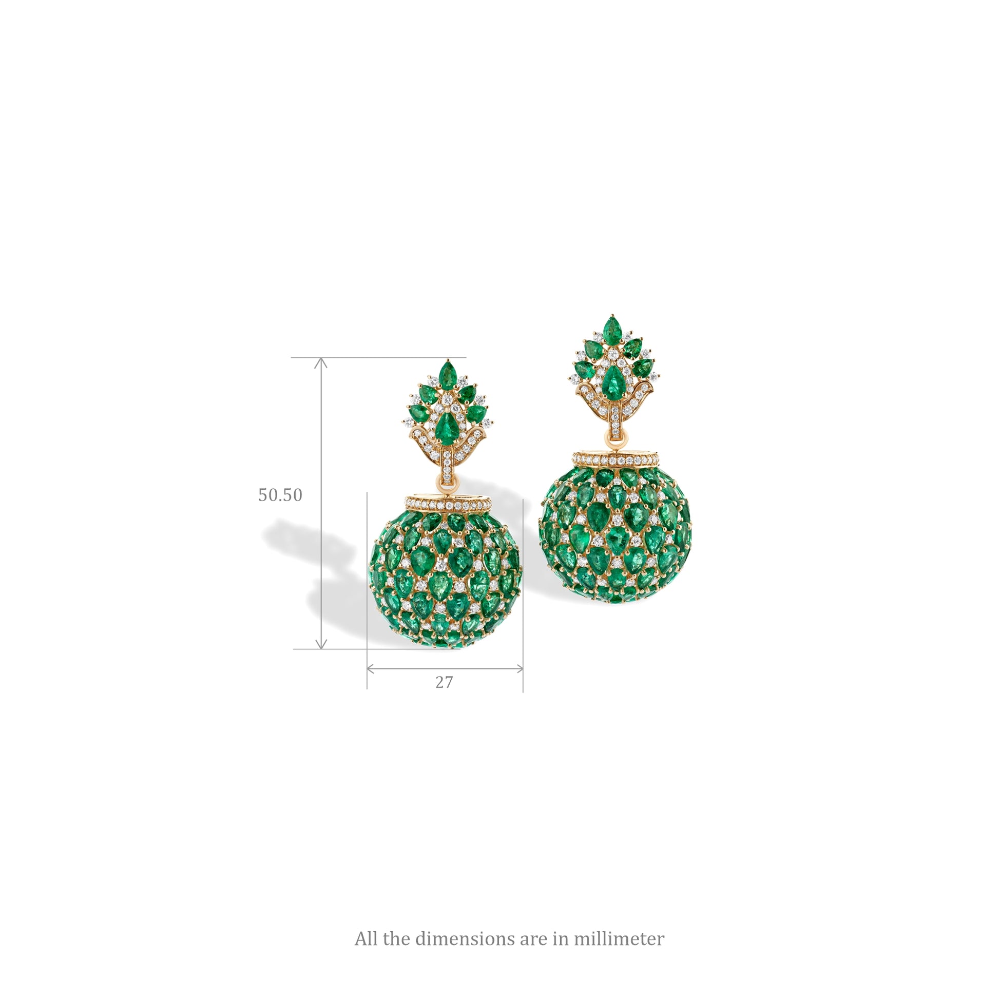 The Emerald Dome Earrings celebrate the grandeur and symmetry of Mughal architecture. Crafted in 18KT gold, they feature a scalloped upper frame with a circular emerald-studded dome, accented with natural diamonds that shimmer like royal pavilion ceilings. Elegant and majestic, these earrings embody timeless artistry and regal sophistication.