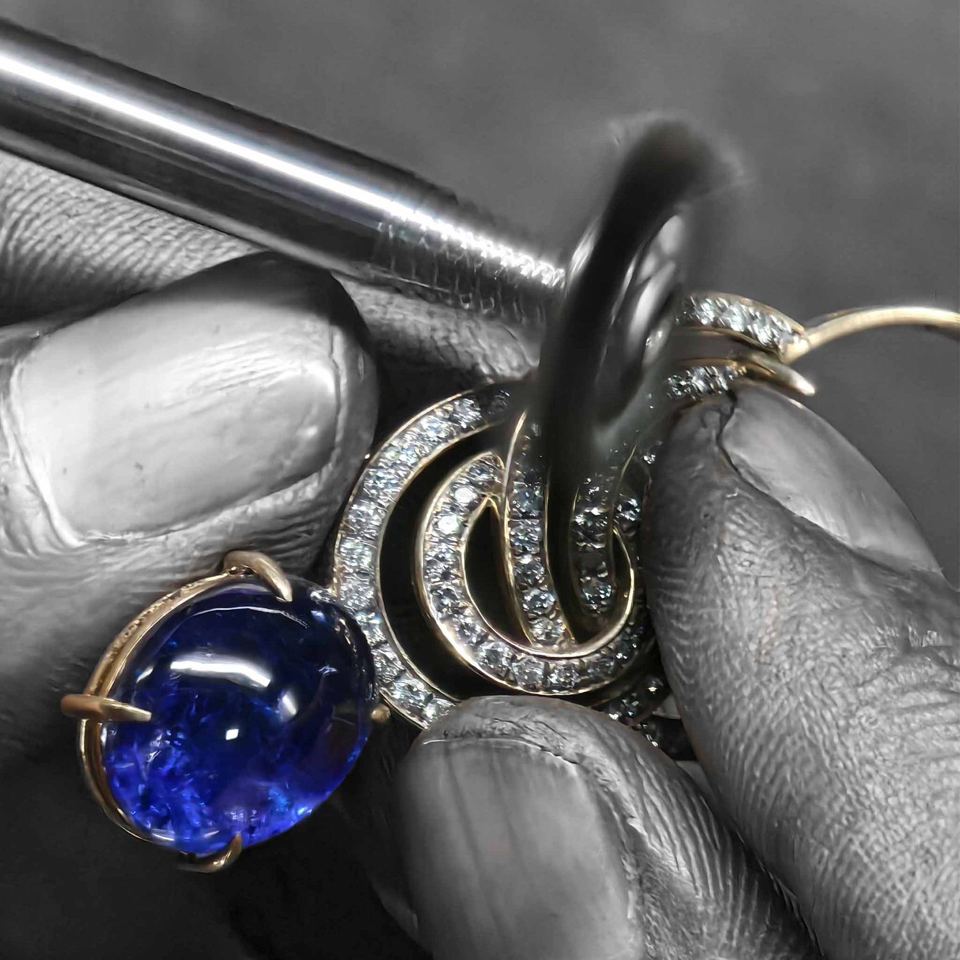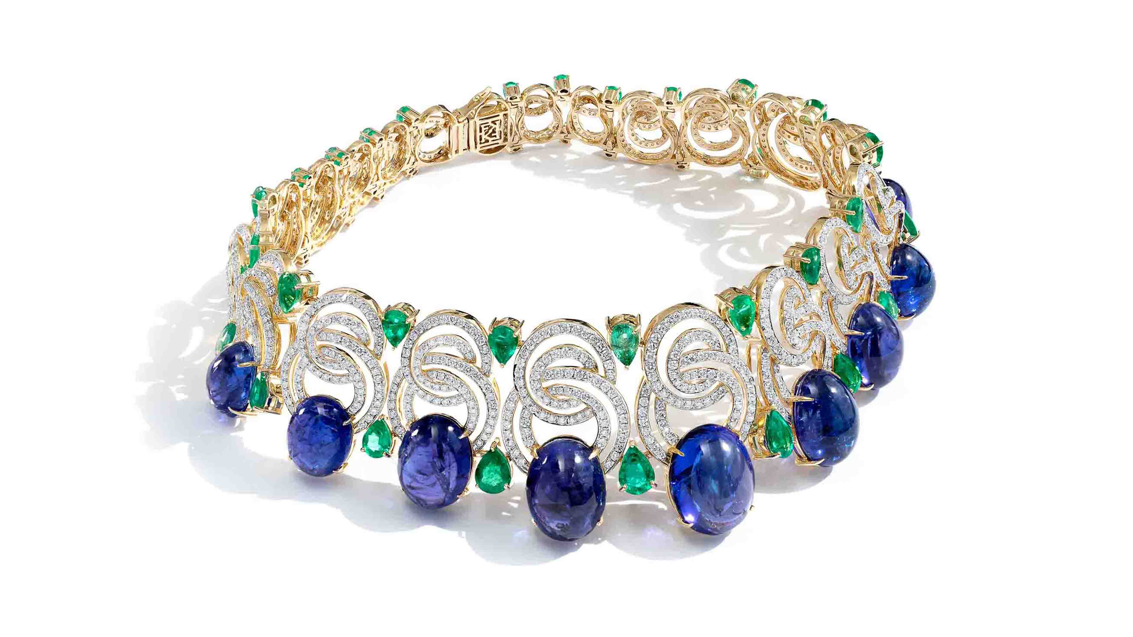 Crafted in 18kt gold, the design features natural emeralds, diamonds, and blue cabochons — each stone chosen to evoke the serene yet powerful spirit of nature’s living rhythm.