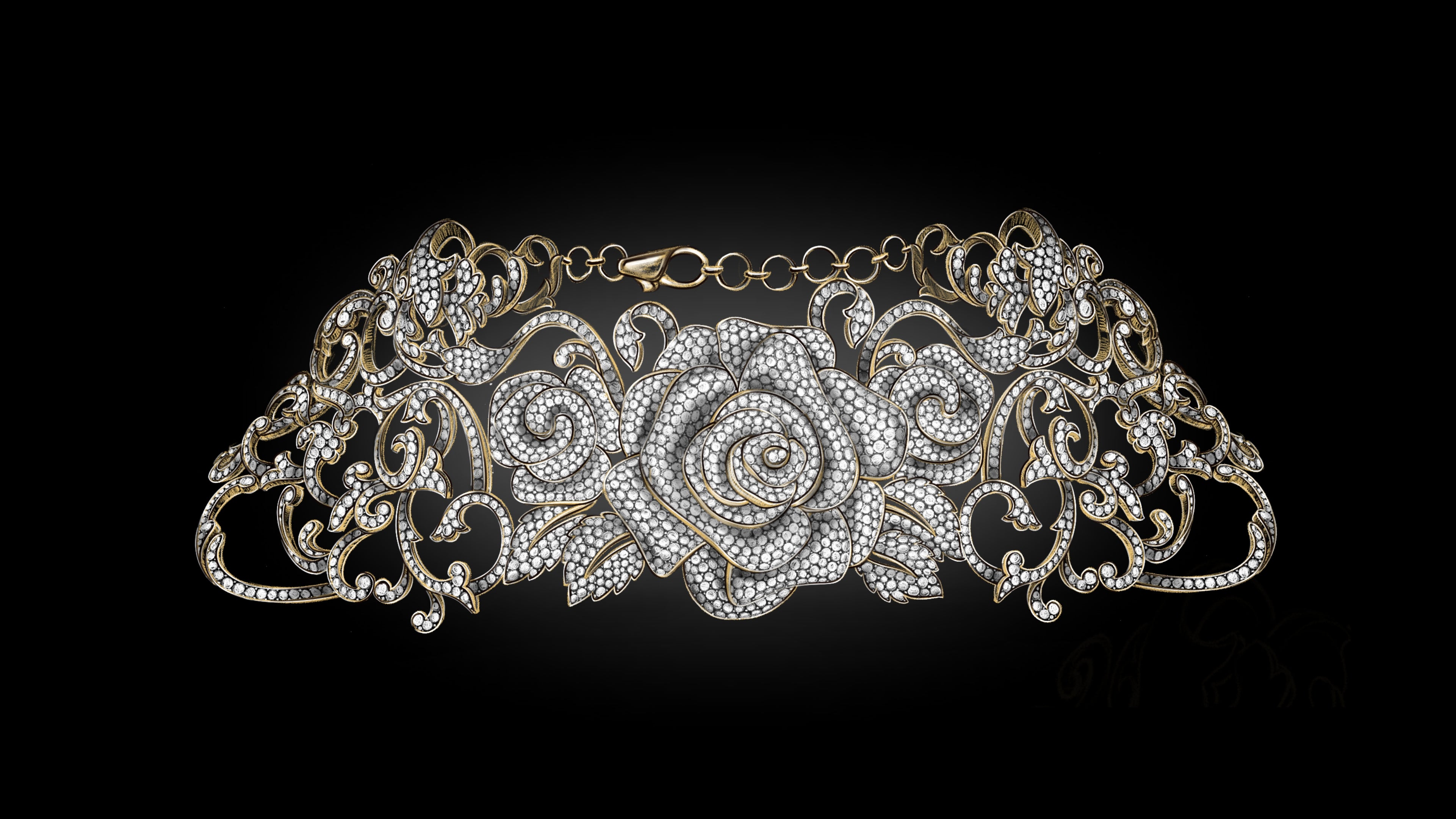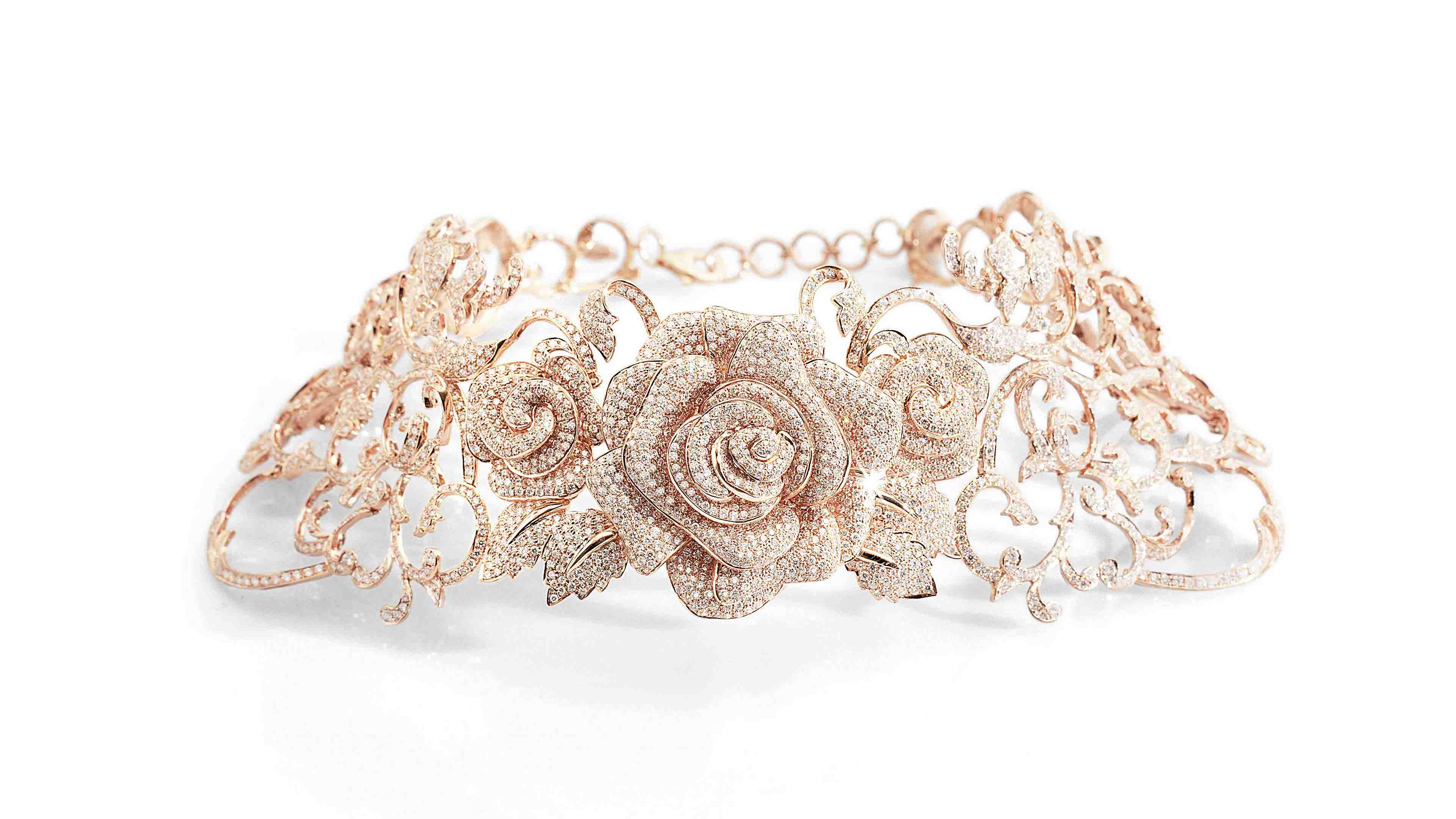 Handcrafted in 18kt gold, the choker and earrings are set with natural diamonds that illuminate every curve, symbolising eternal love and refined artistry.