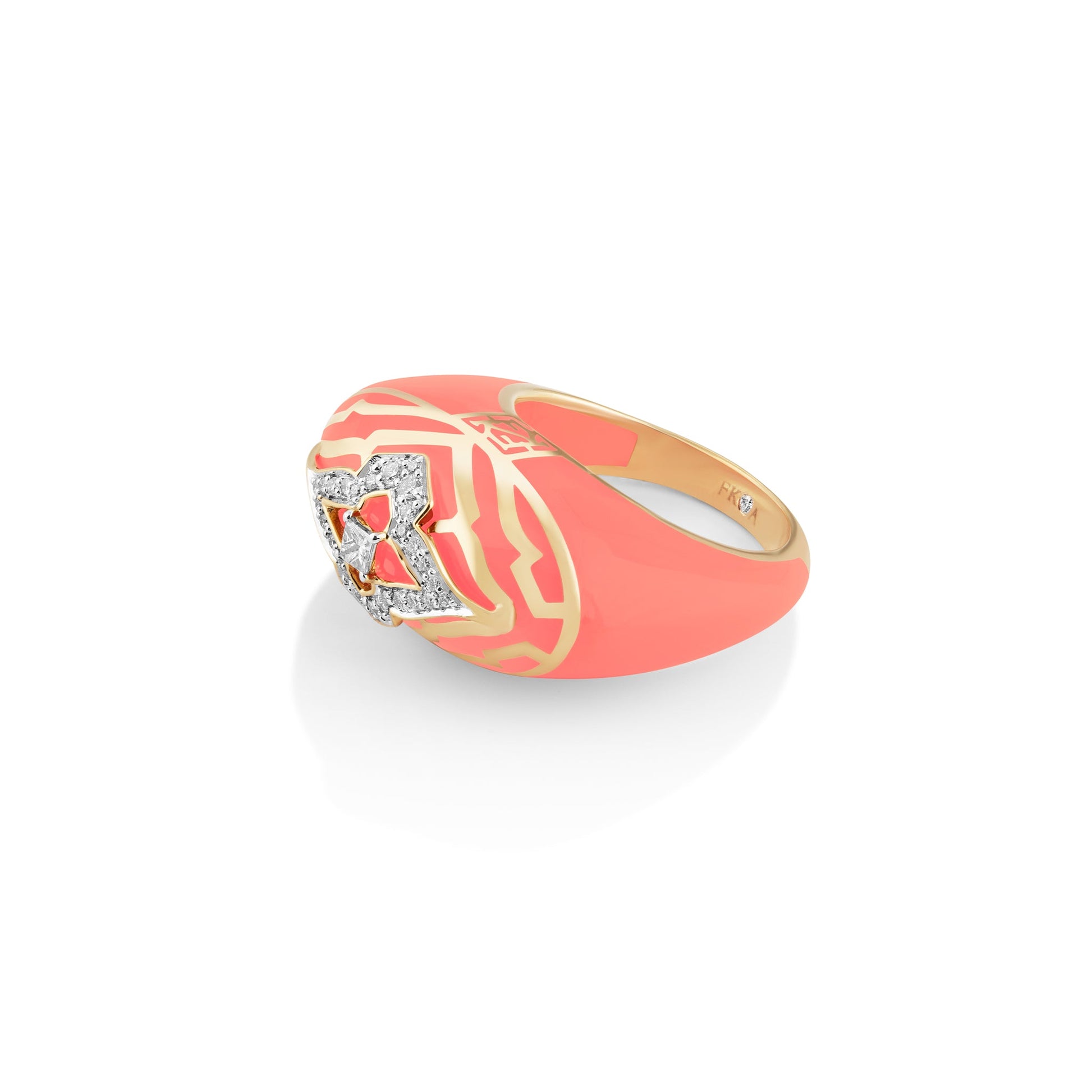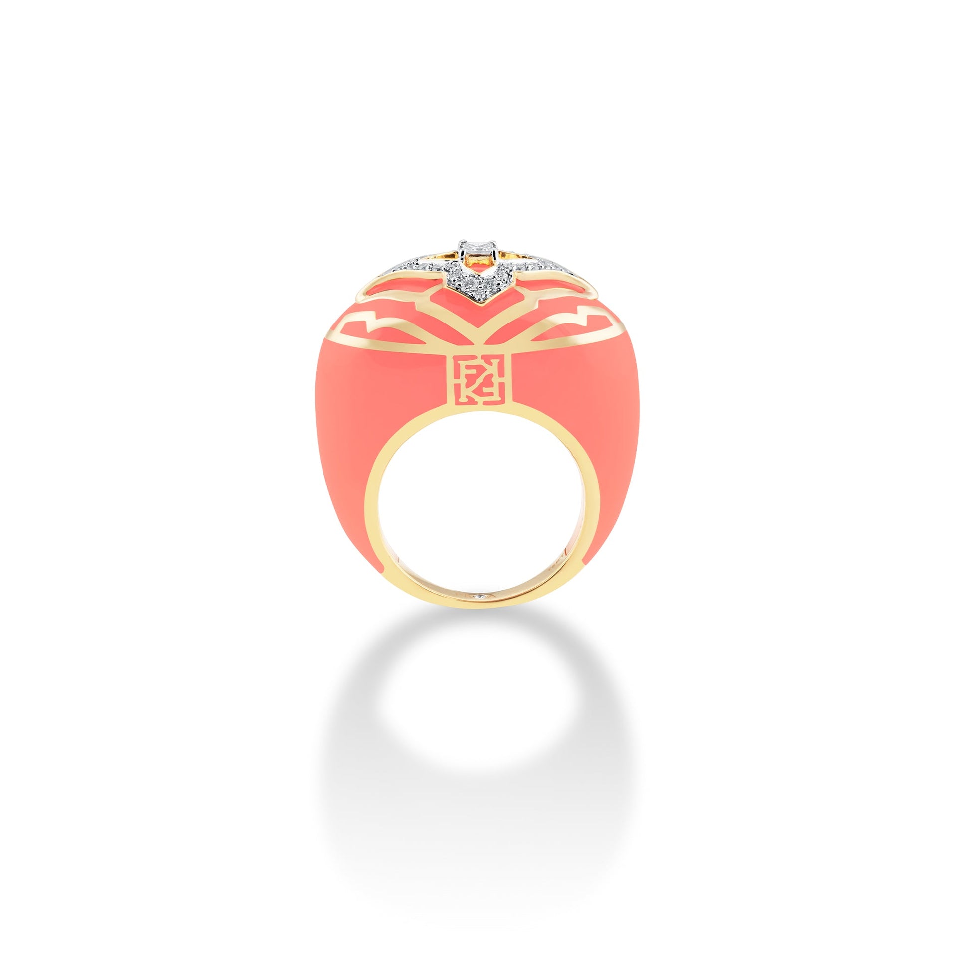 The Florence Vivacious ring is a poetic reflection of the city's romantic allure in every coral infused detail. Crafted in 18kt gold, natural diamonds and ceramic this ring is for the fearless traveller for the cheerful who travels to experience new opportunities along her way.