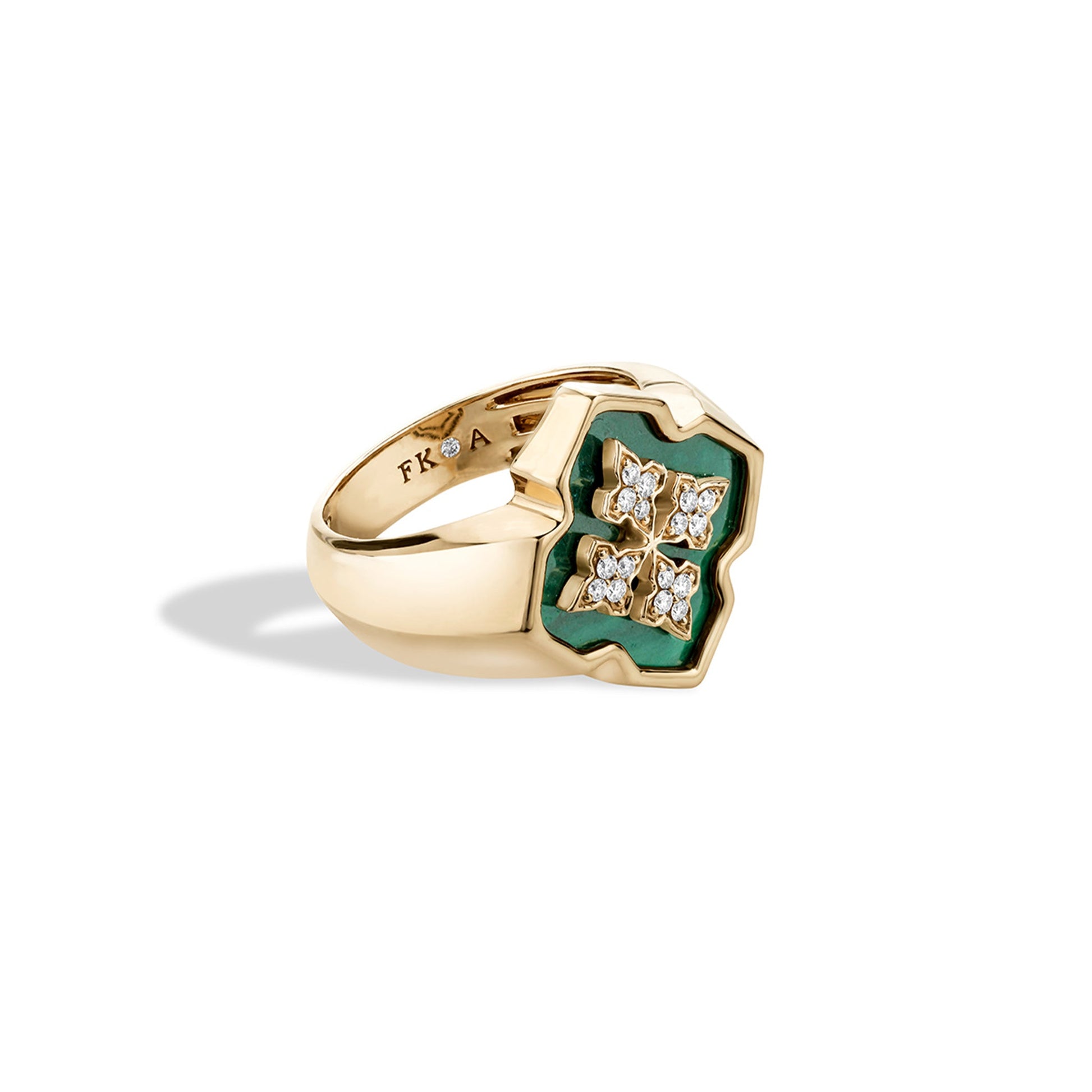 The Grounded Spirit Ring draws its energy from the earthy richness of Malachite, a tribute to stability and presence. With its deep green striations, set in 18K gold and accented with natural diamonds, this piece is for the woman who stands firm in her truth and carries strength with quiet elegance.