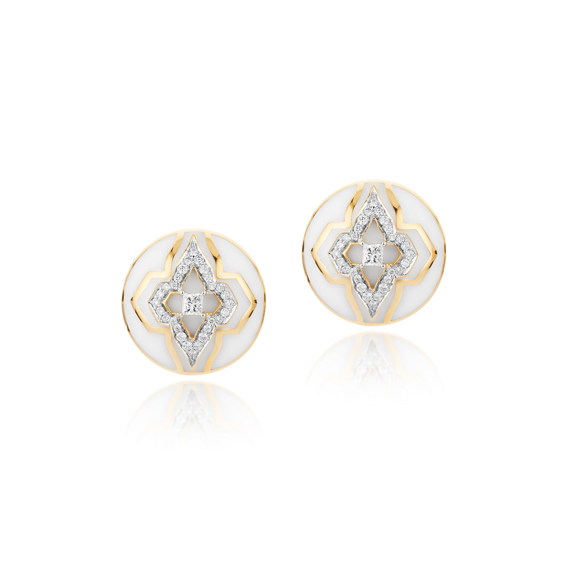Inspired by the serene snow-capped mountains of Gstaad that stand tall with its slopes pure white and exquisite, these audacious earrings are for the fearless traveller who follows the world map just as finely as her inner map. It is masterfully crafted in ceramic with svelte lines of 18 kt gold and studded with natural diamonds.