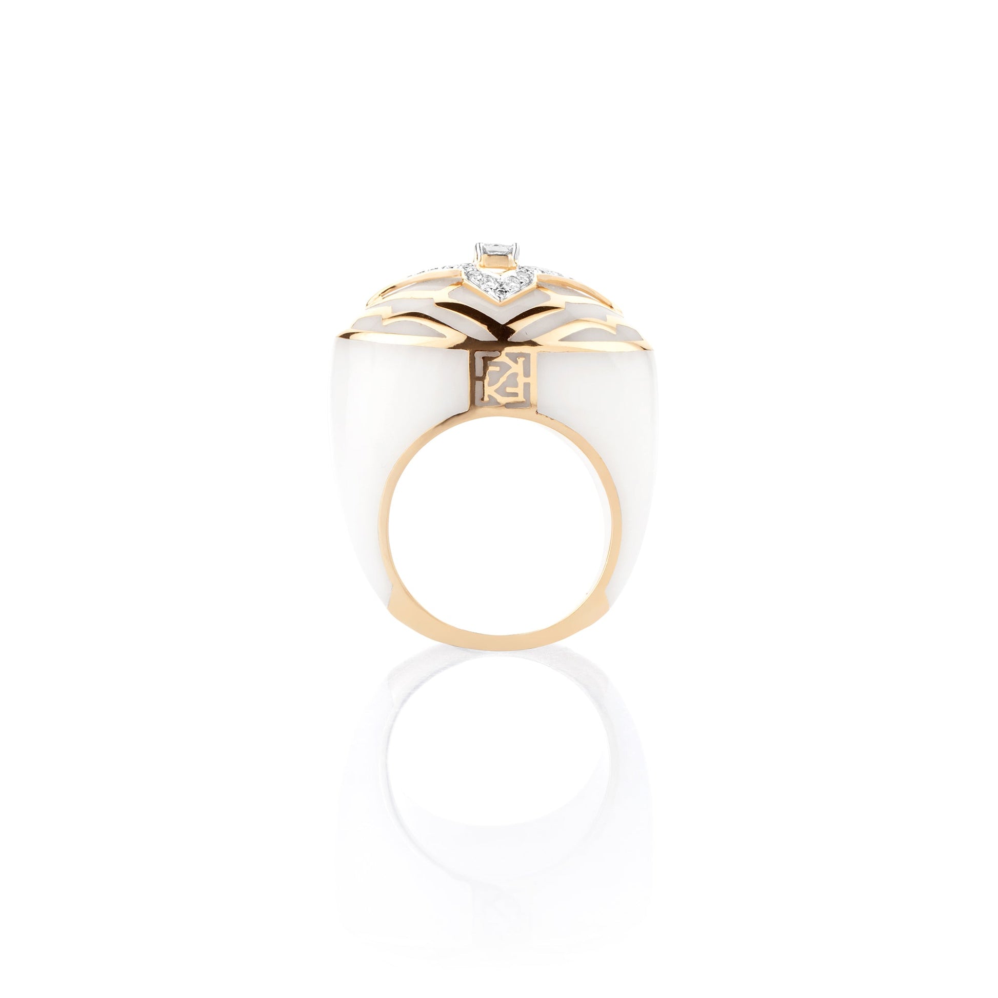 Inspired by the serene snow-capped mountains of Gstaad that stand tall with its slopes pure white and exquisite, this vivacious ring is for the cheerful, free-spirited traveller who travels to experience new opportunities along her way. It is masterfully crafted in ceramic with svelte lines of 18 kt gold and studded with natural diamonds.