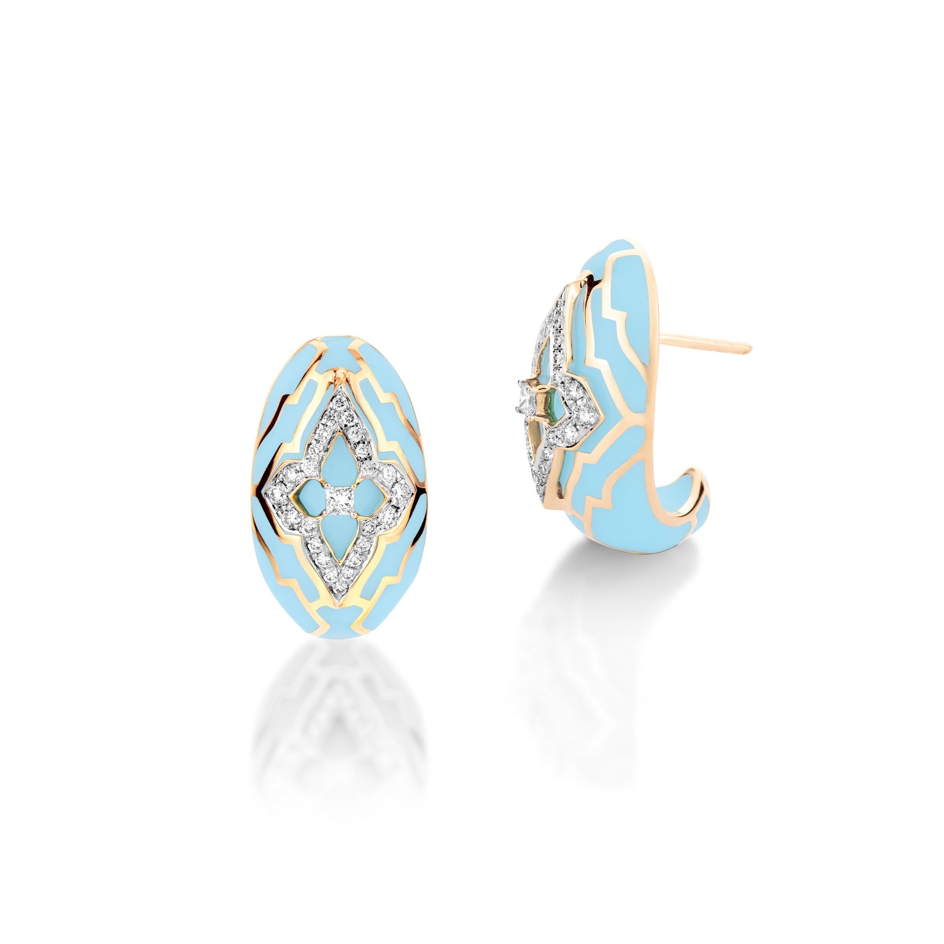 Inspired by the glorious palaces and forts surrounded with homes decorated in shades of the colour blue in the city of Jodhpur, these day dreamer earrings are for the traveller who manifests her day dreams into existence. It is masterfully crafted in ceramic with svelte lines of 18 kt gold and studded with natural diamonds.