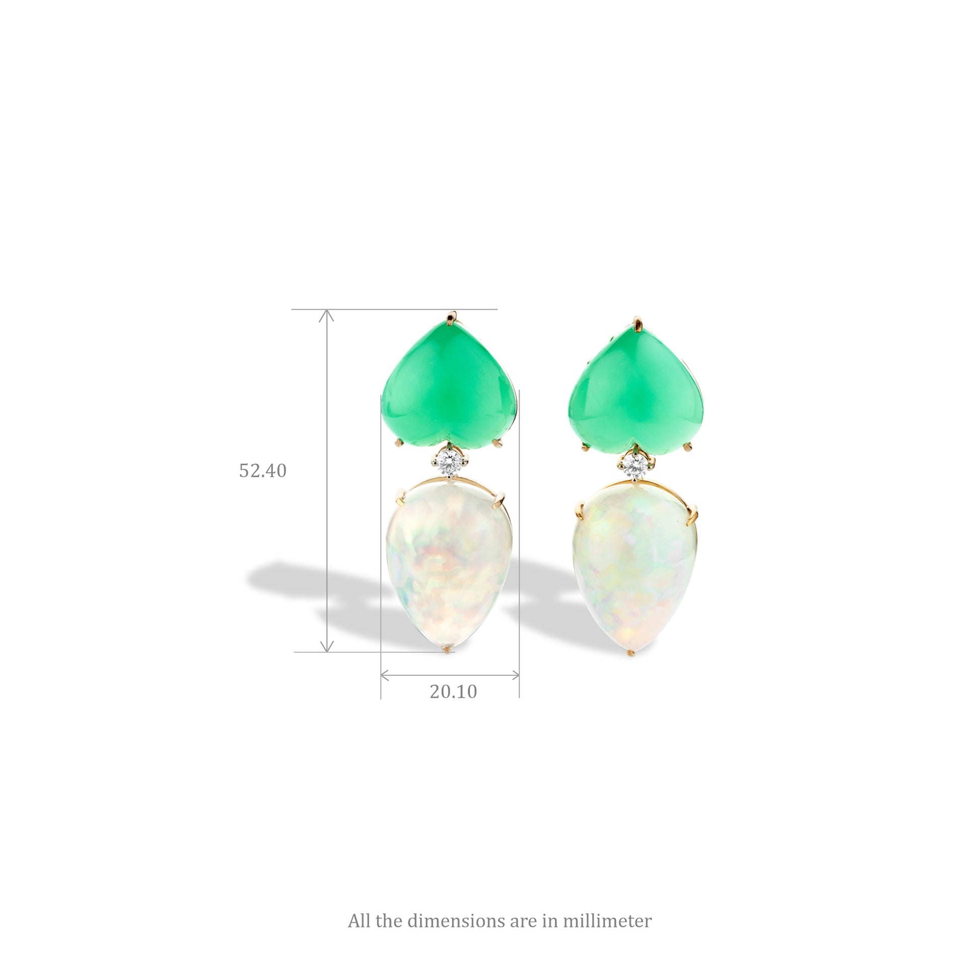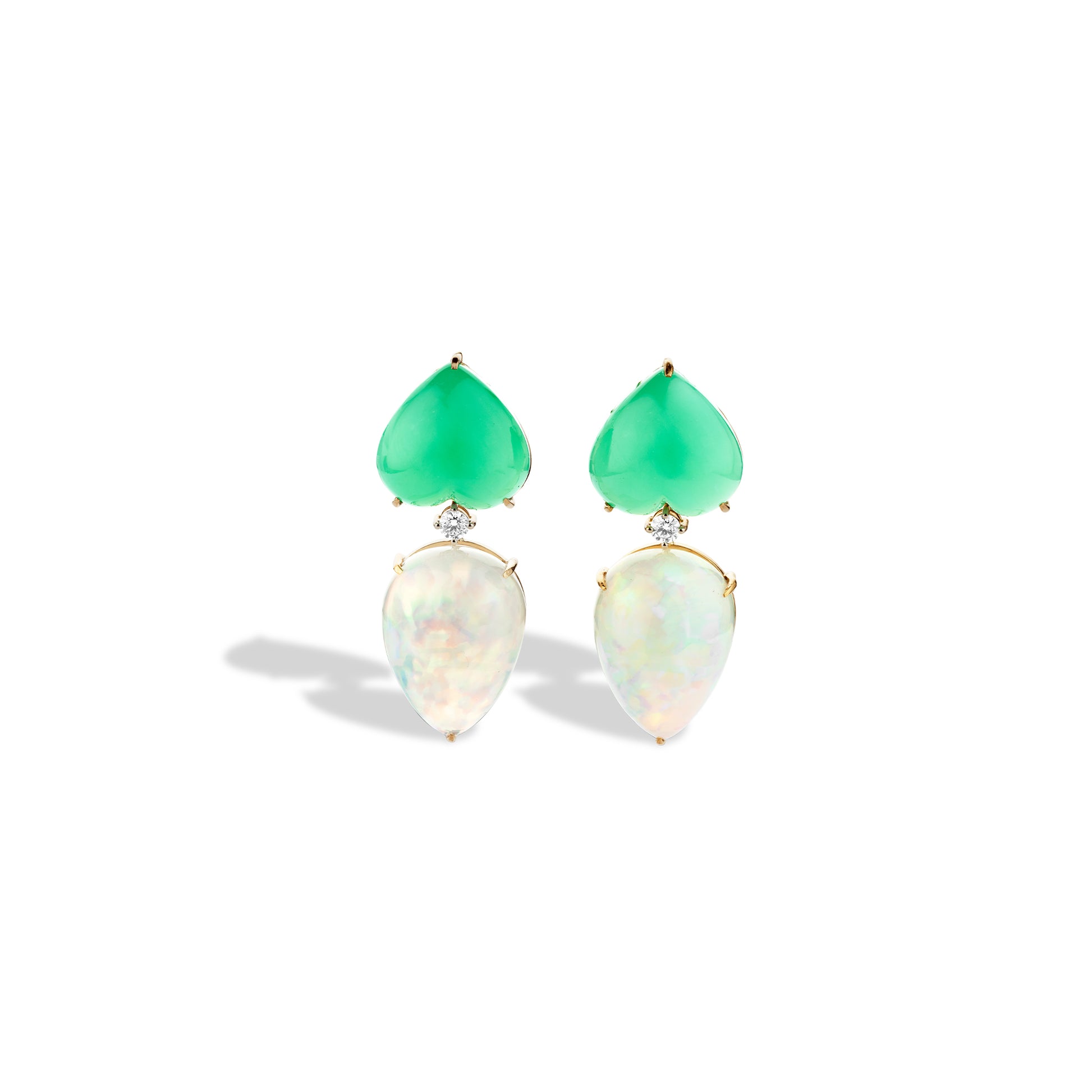 The Moonlit Heart Earrings blend twilight inspiration with gentle radiance. Crafted in 18KT gold, they feature a heart-shaped chrysoprase in a soft, luminous green paired with a glowing opal drop that reflects moonlit shimmer. A single natural diamond links the two elements, adding a touch of refined brilliance. A serene and elegant design, inspired by the calm beauty that lingers just after rainfall.