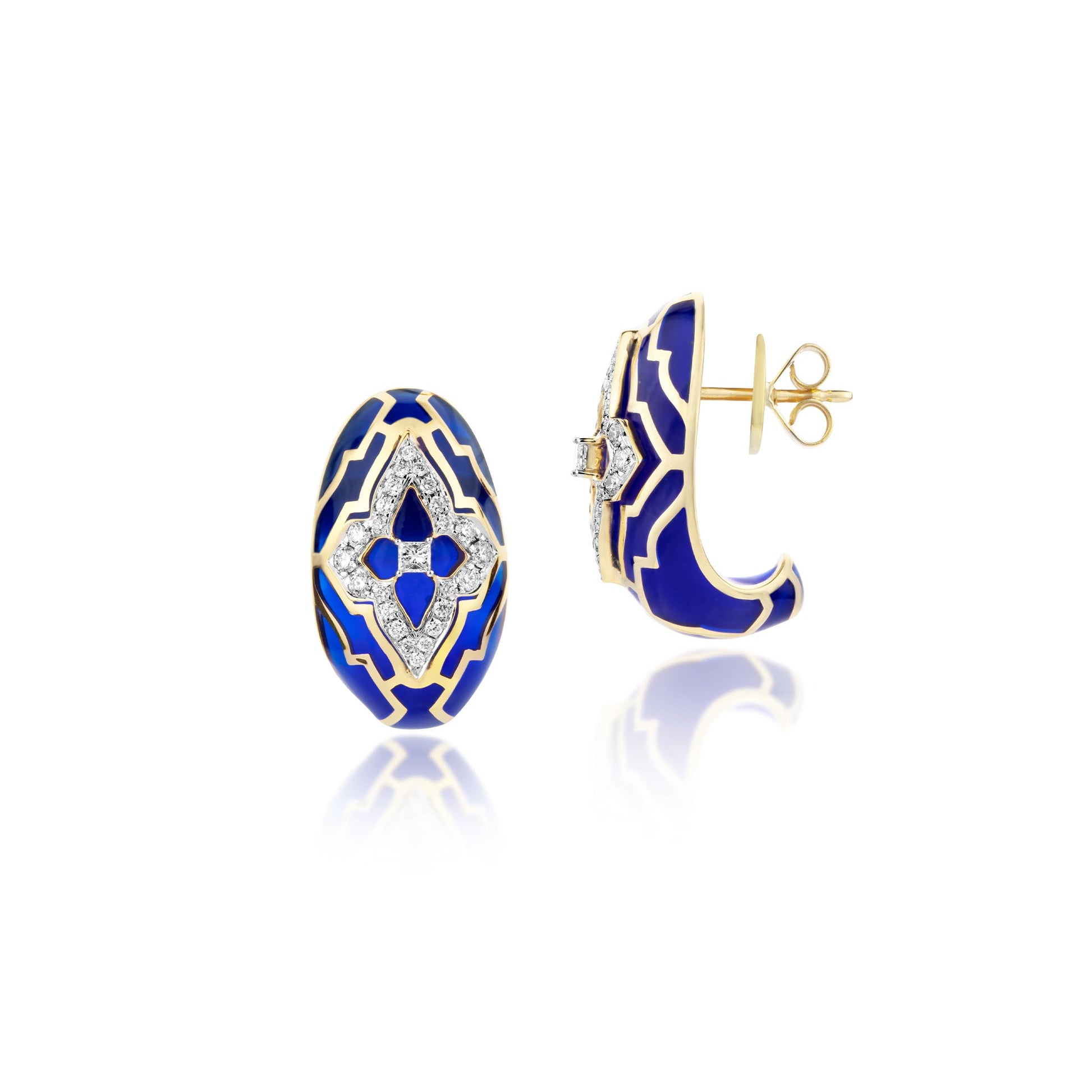 Inspired by the mystical deep blue of the Aegean sea and the colour blue embedded in the architecture of Mykonos, these day dreamer earrings are for the traveller who manifests her day dreams into existence. It is masterfully crafted in ceramic with svelte lines of 18 kt gold and studded with natural diamonds.