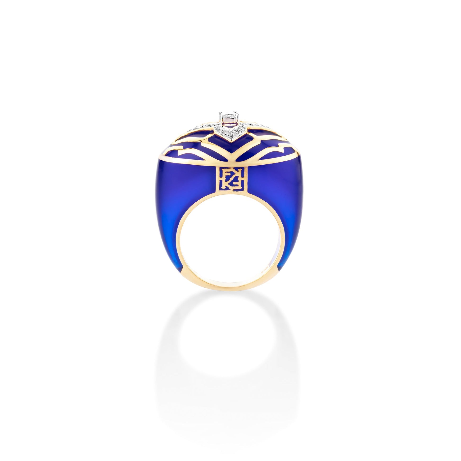 Inspired by the mystical deep blue of the Aegean sea and the color blue embedded in the architecture of Mykonos, this vivacious ring is for the cheerful, free-spirited traveller who travels to experience new opportunities along her way. It is masterfully crafted in ceramic with svelte lines of 18 kt gold and studded with natural diamonds.