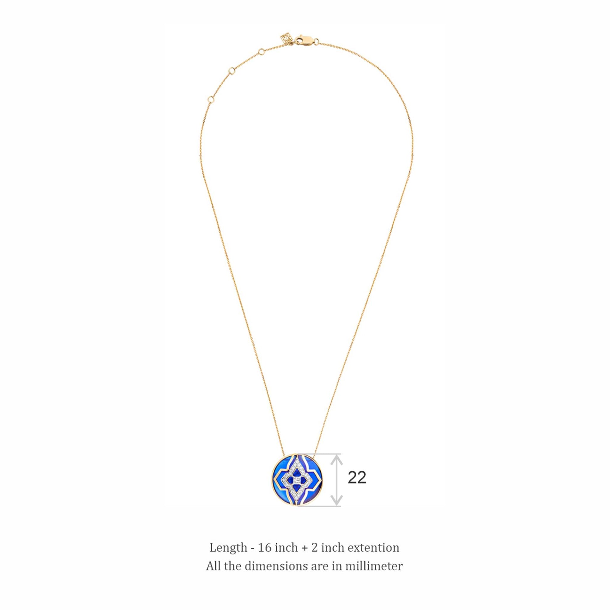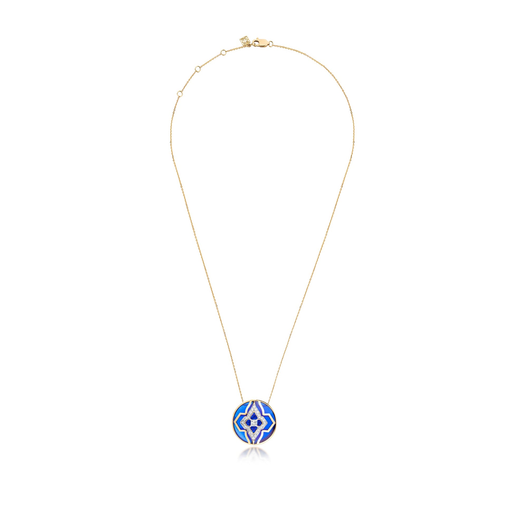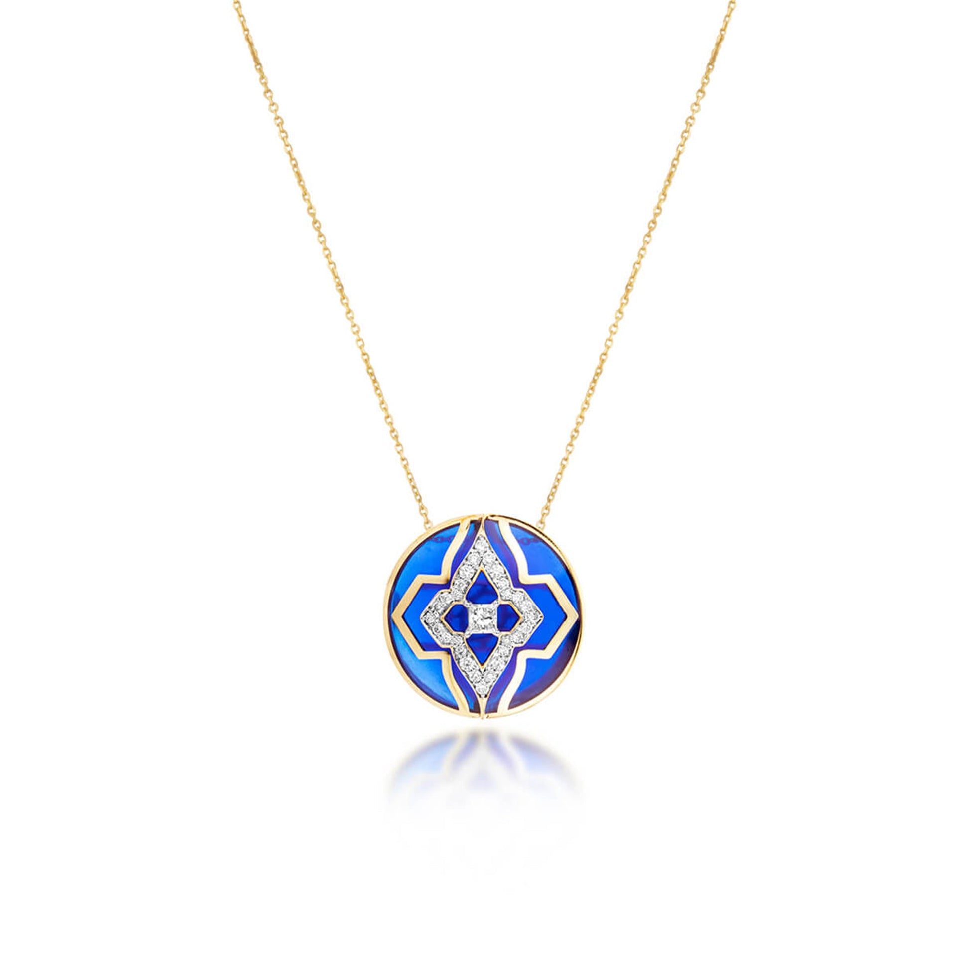 Inspired by the mystical deep blue of the Aegean sea and the colour blue embedded in the architecture of Mykonos, this wanderlust pendant is for the traveller who follows her heart and travels to find herself new experiences. It is masterfully crafted in ceramic with svelte lines of 18 kt gold and studded with natural diamonds.