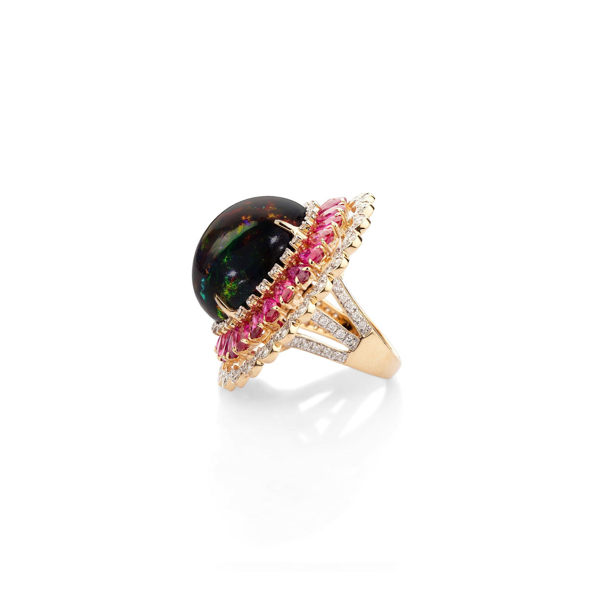 The Nebula Crown Ring captures the infinite beauty of the cosmos in regal form. Crafted in 18KT gold, it features a luminous black opal glowing with shifting hues, encircled by vivid pink sapphires and delicate diamond scallops that echo a celestial sunrise. A masterpiece of light and color, it celebrates cosmic wonder and eternal radiance.