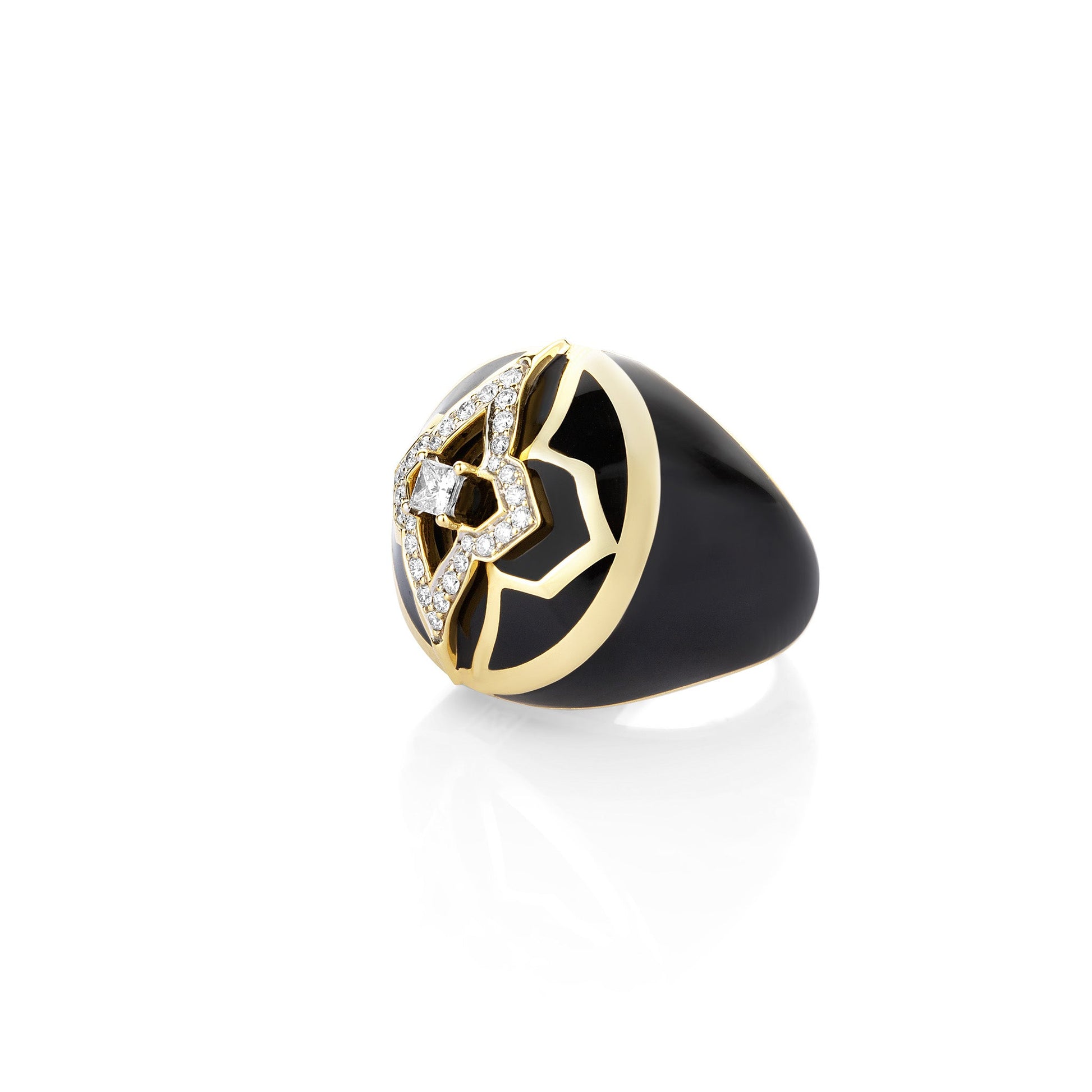 Inspired by the urban jungle of futurism and contemporary architecture, elegance and eroticism of the city of New York, this globetrotter ring is for the worldly refined traveller who makes a suave statement by being herself. It is masterfully crafted in ceramic with svelte lines of 18 kt gold and studded with natural diamonds.