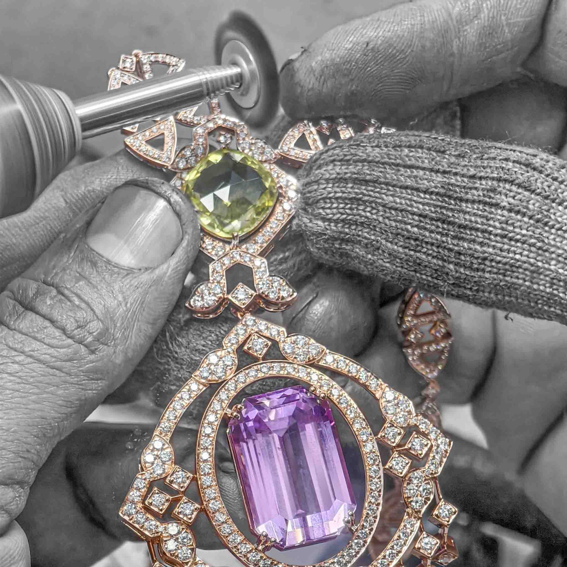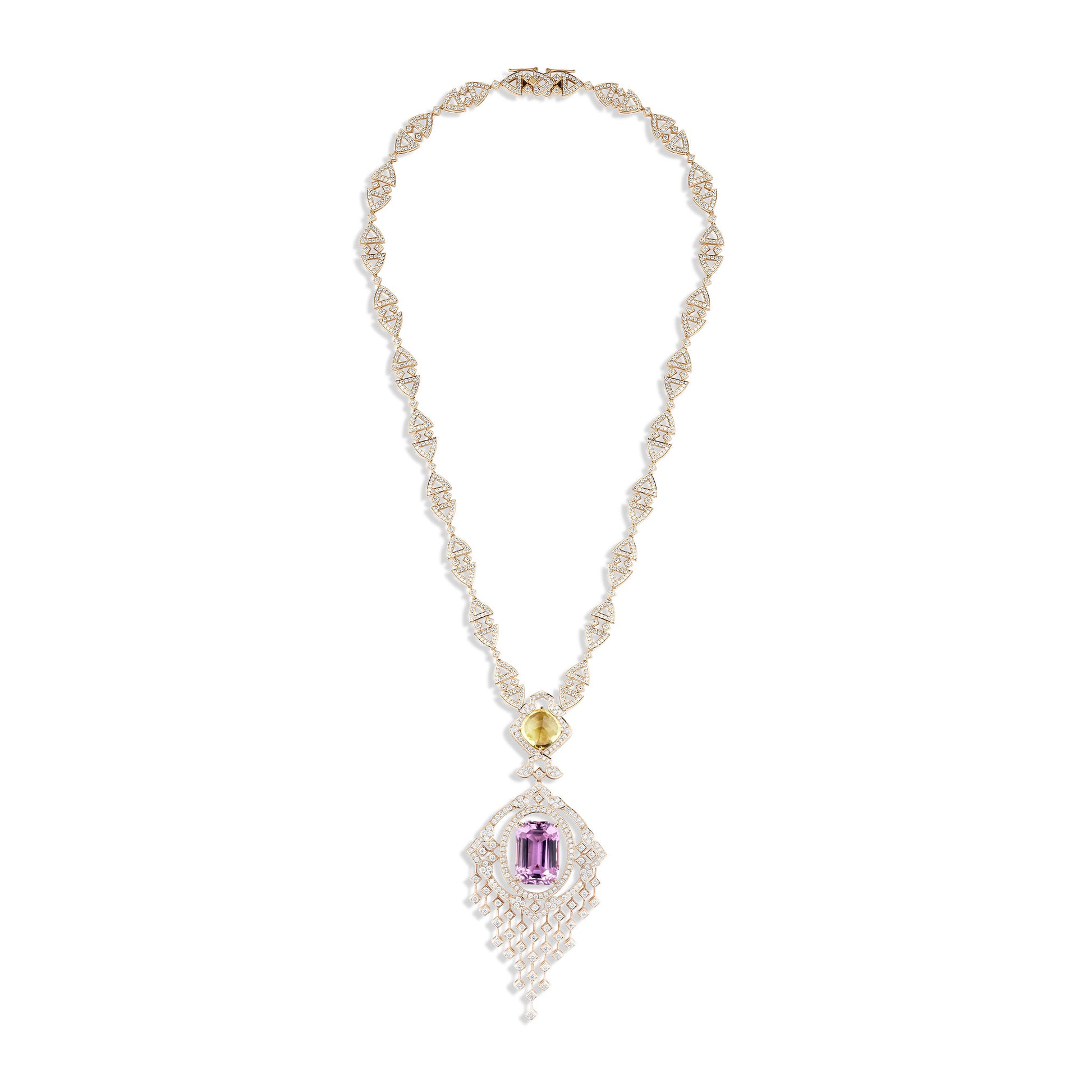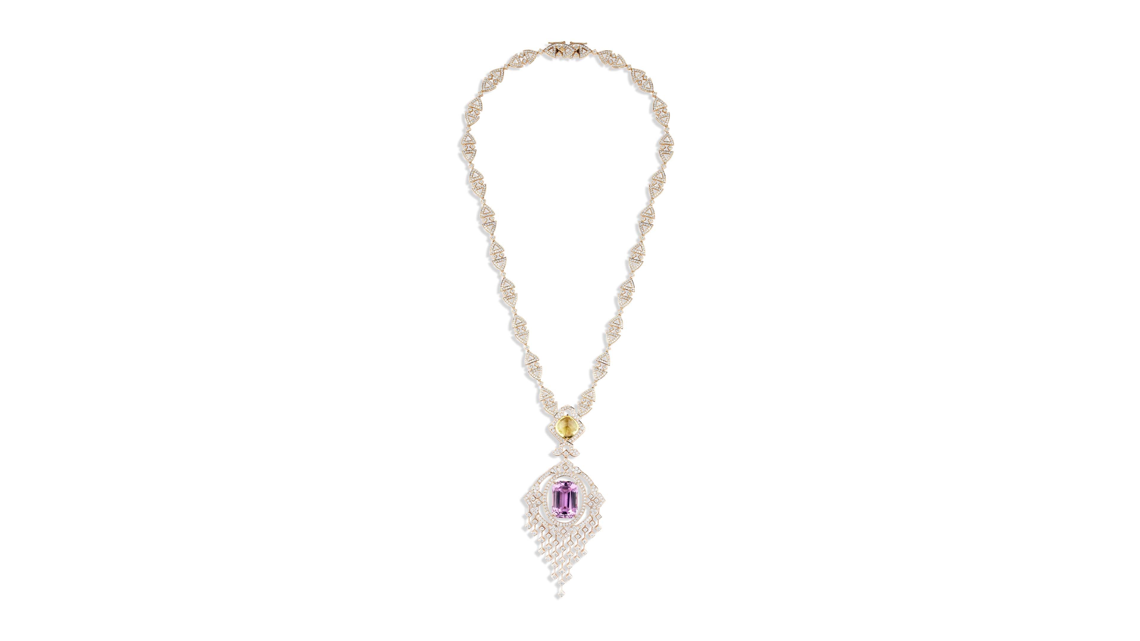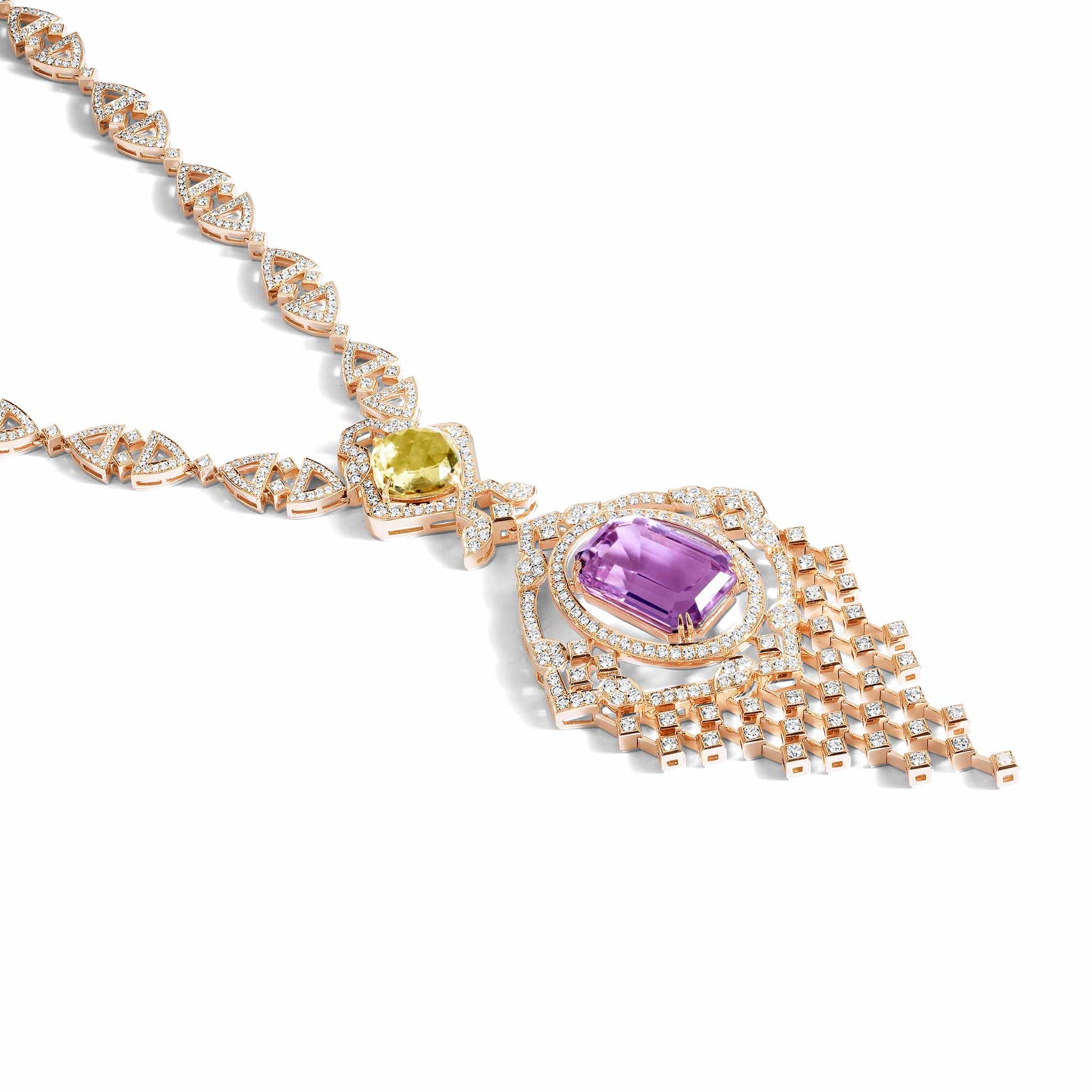 Crafted in 18kt gold, the design features natural diamonds, a golden citrine, and a rich amethyst, each chosen for its brilliance and depth of colour — uniting light and shadow in a symphony of elegance.