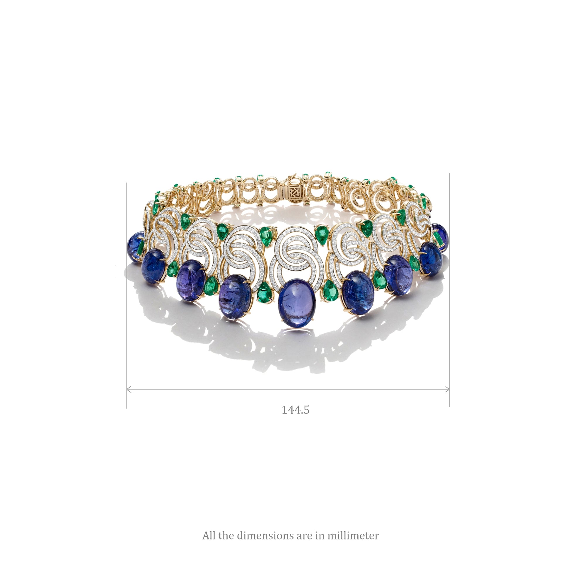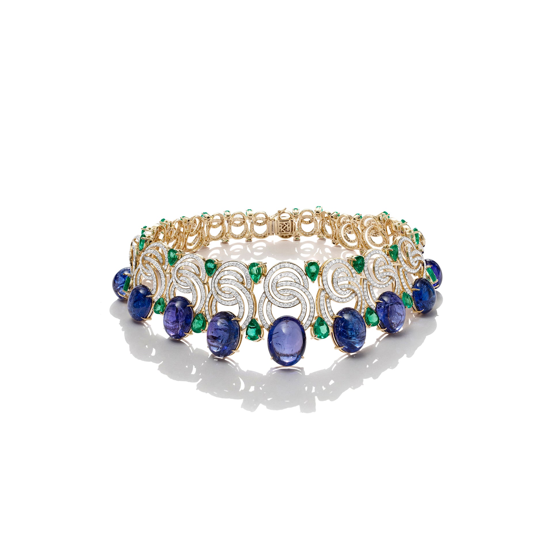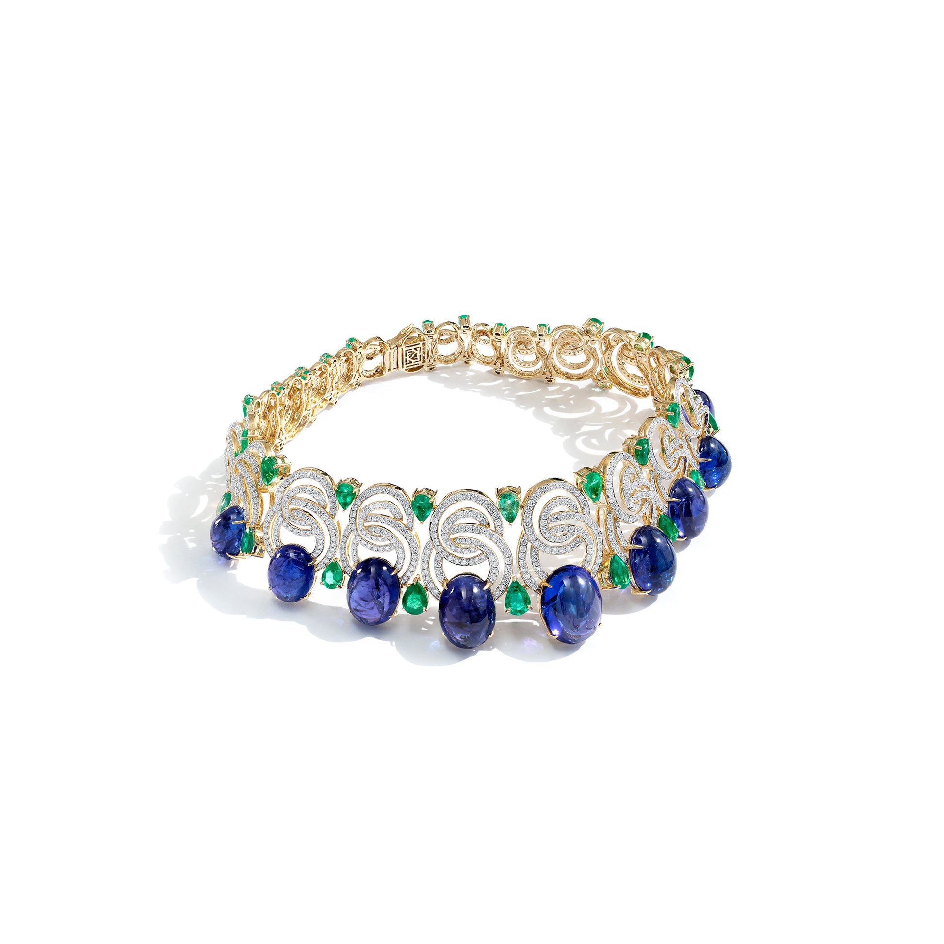 The Ocean’s Embrace Necklace captures the serene power and poetry of the sea. Crafted in 18KT gold, it features rippling golden curves, sparkling natural diamonds, emerald accents, and vivid blue cabochons that evoke ocean depths. Elegant and captivating, this necklace embodies the calm, strength, and timeless beauty of the ocean.
