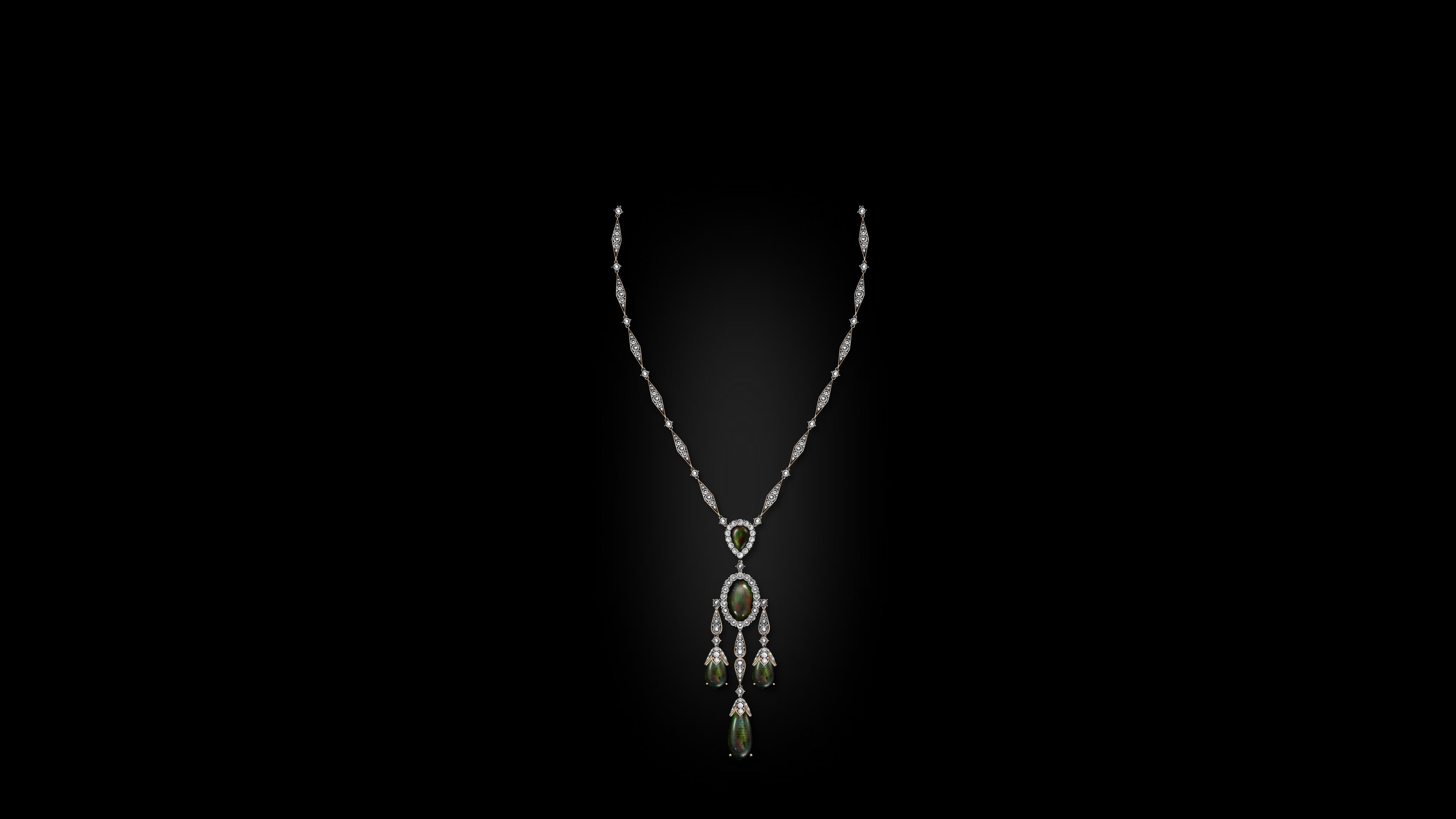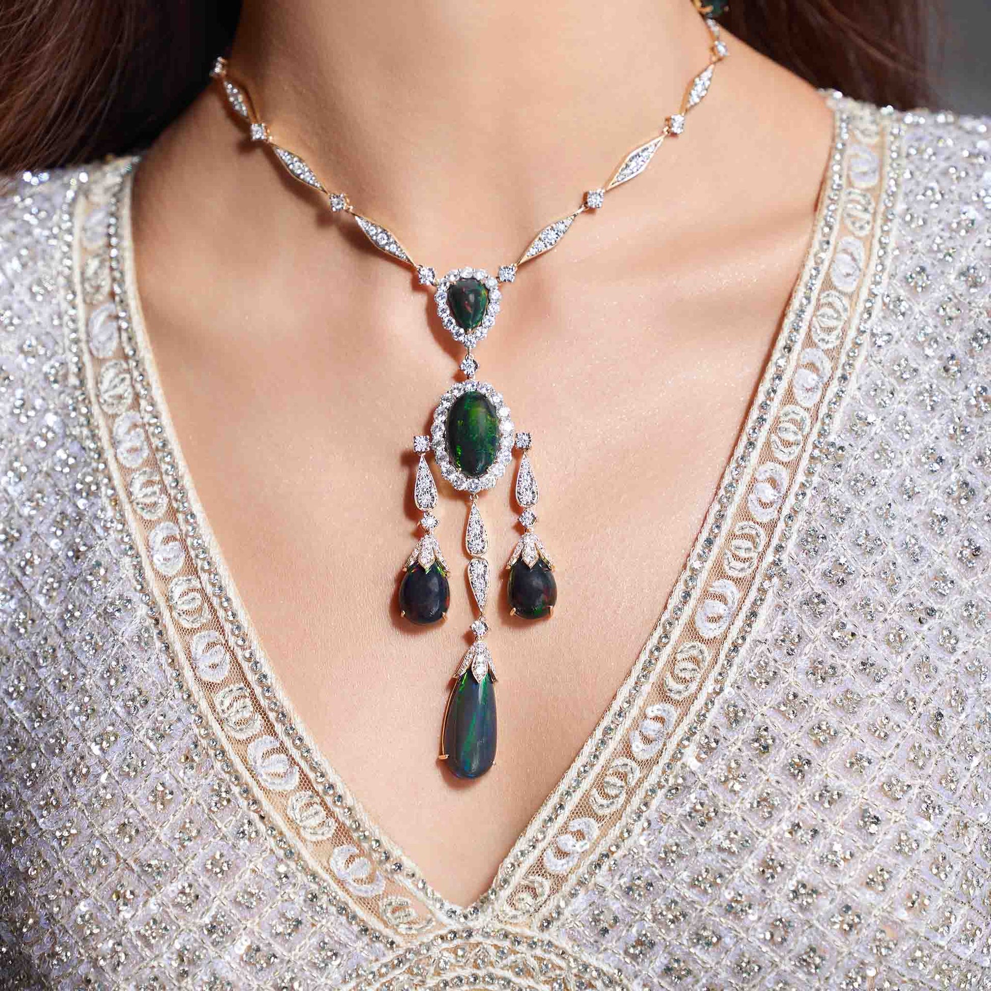 Crafted in 18kt gold, the design unites natural black opals with fine diamonds — each gemstone chosen for its brilliance, fire, and harmony, creating a masterpiece of light and shadow.
