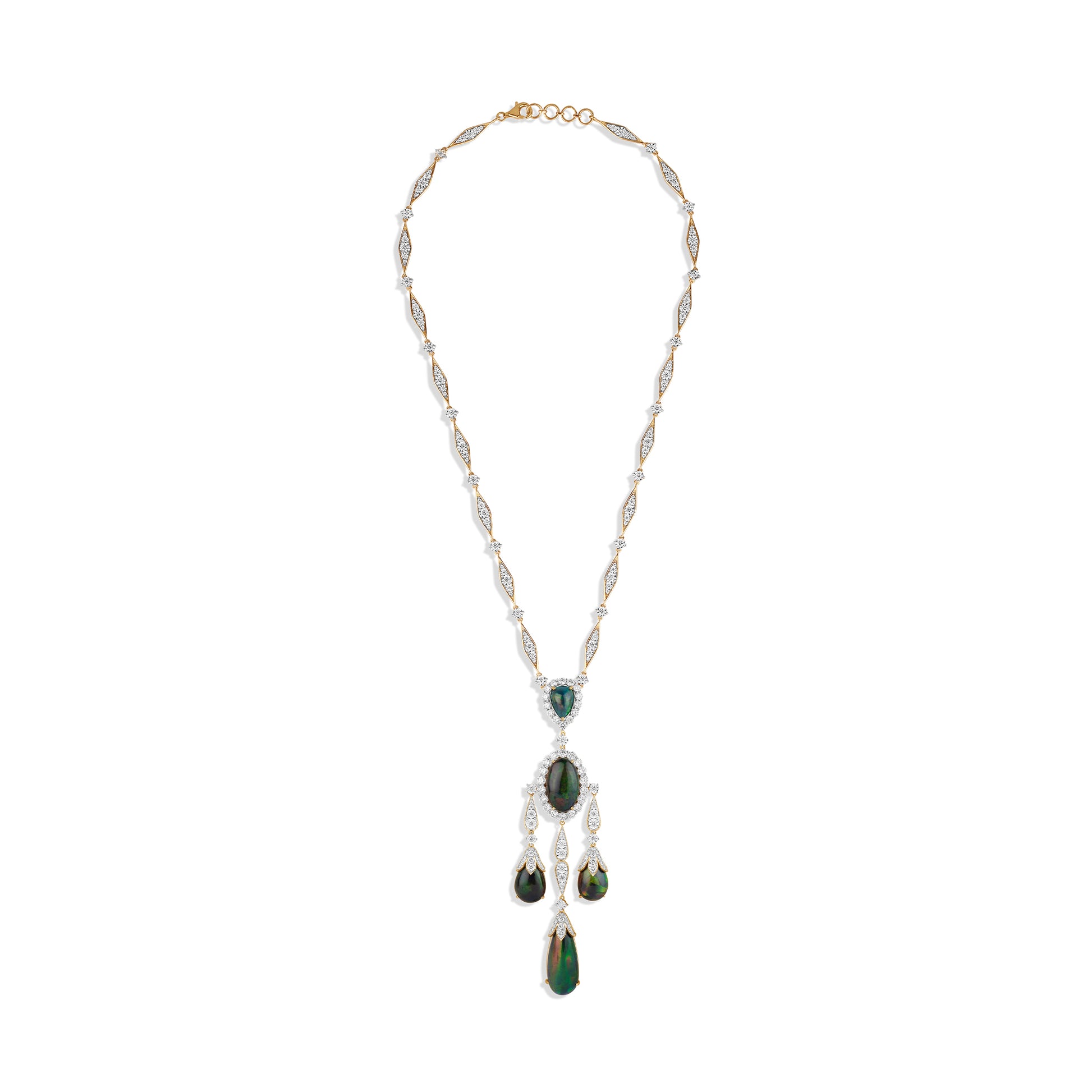 The Opal Constellé Necklace captures celestial grandeur in a cascade of opals and diamonds that gleam like stars suspended in motion. Crafted in 18KT gold, it features black opals with vivid green and blue iridescence, accented by diamond-studded leaves that trace the neckline with fluid grace. Designed to move with elegance, this masterpiece celebrates opulence, rarity, and the timeless allure of the cosmos.
