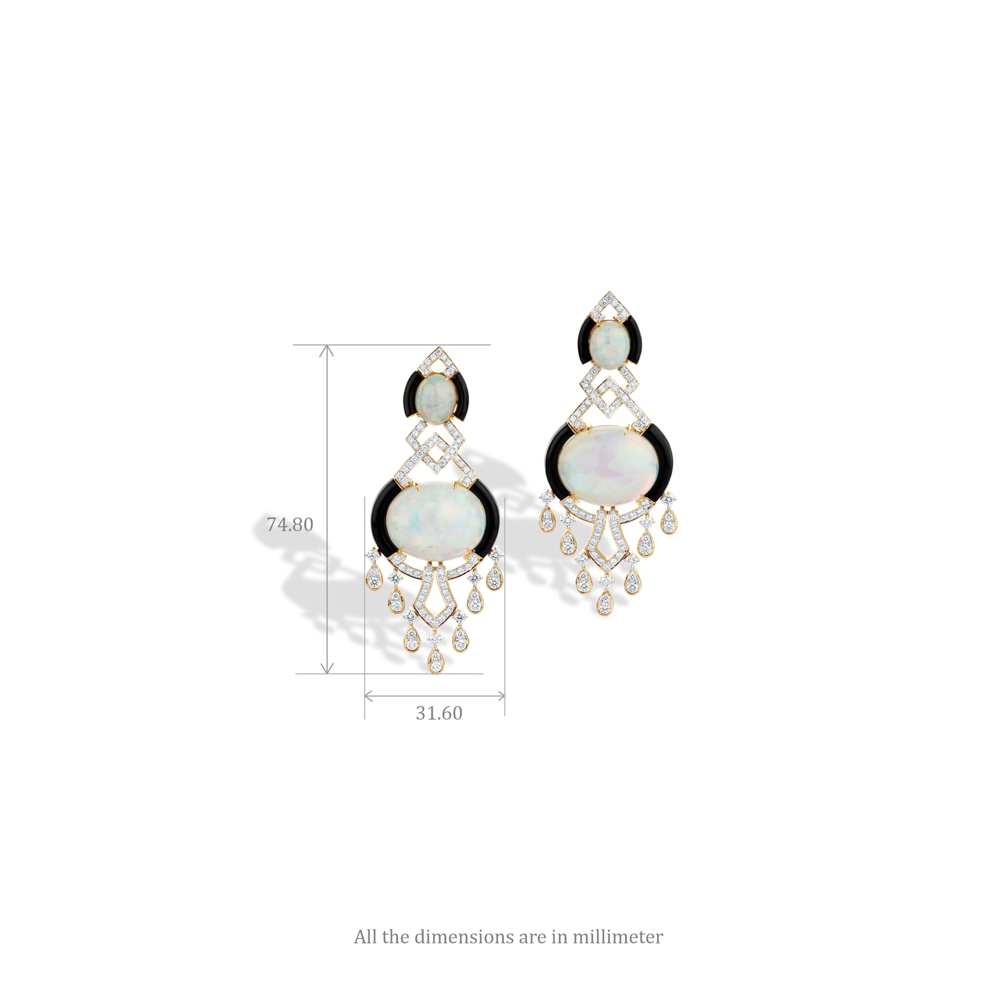 The Opus of the Cosmos Earrings embody celestial harmony, blending light, geometry, and brilliance in perfect balance. Crafted in 18KT gold, they feature luminous opals that shimmer with cosmic hues, framed by bold black enamel and intricate diamond detailing inspired by Art Deco design. Elegant and powerful, they bring the mystique of the stars to every movement — a wearable reflection of the infinite.
