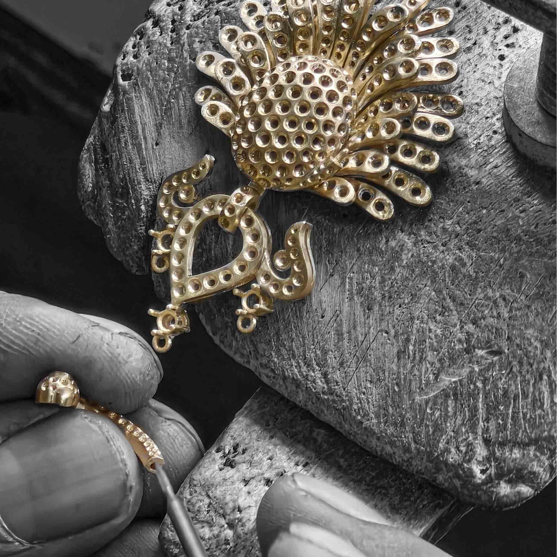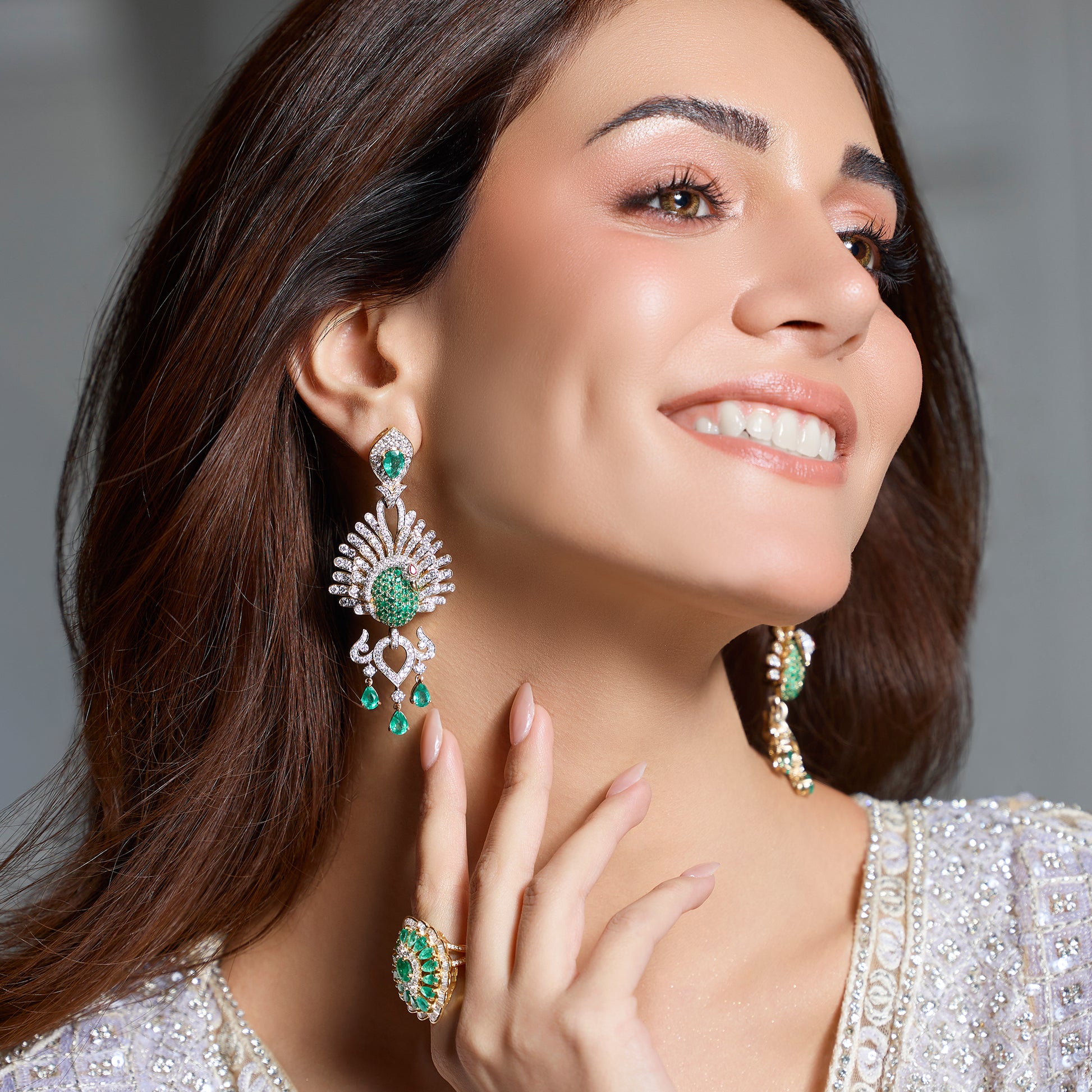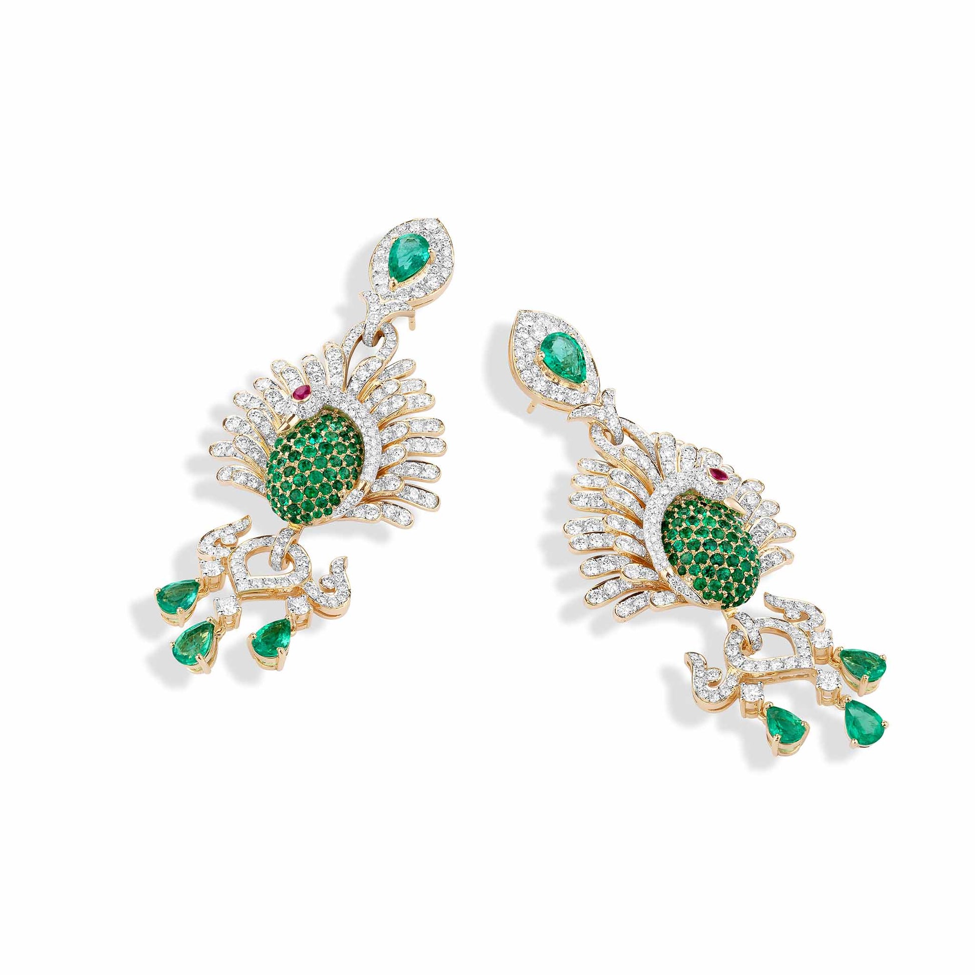 The Peacock Waltz Earrings capture the elegance and vitality of nature’s most enchanting dance. Crafted in 18KT gold, they feature hand-carved emeralds that unfurl like peacock feathers in motion, accentuated by natural diamonds that shimmer with every movement. Exuding grace, vibrance, and timeless allure, these earrings are a celebration of beauty in motion — an ode to nature’s rhythm and the art of effortless elegance.