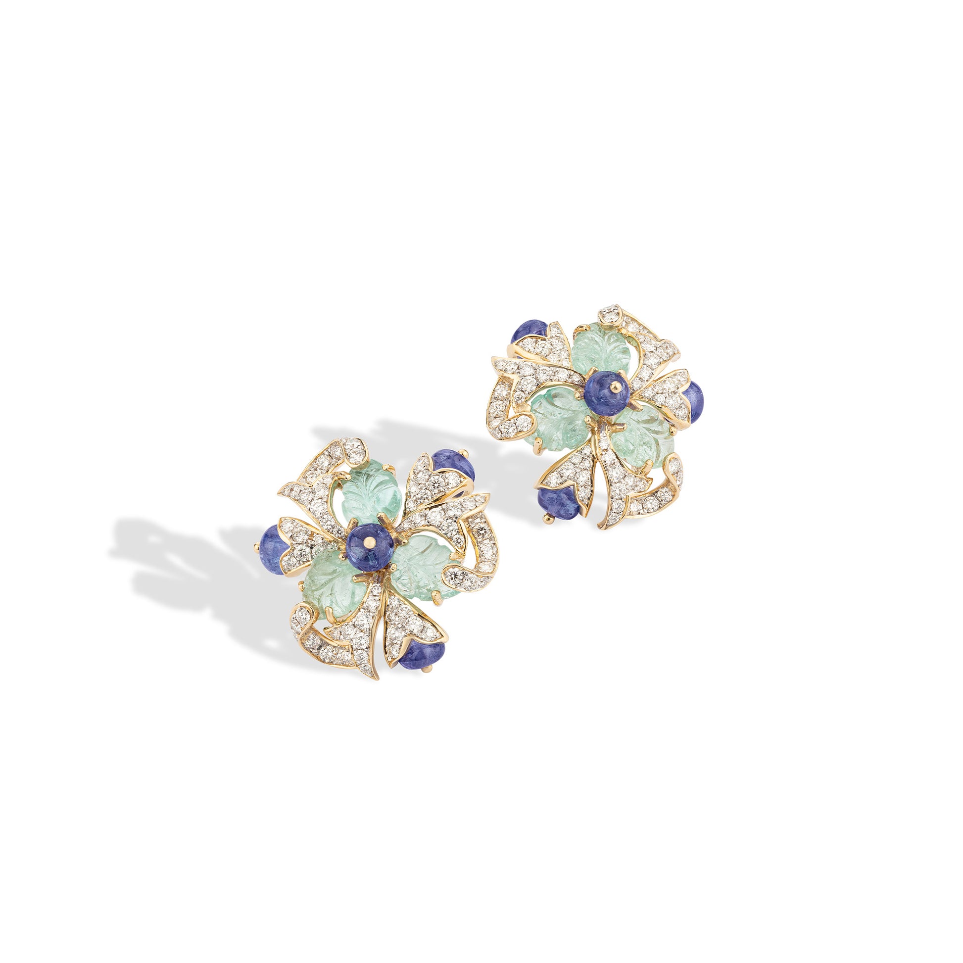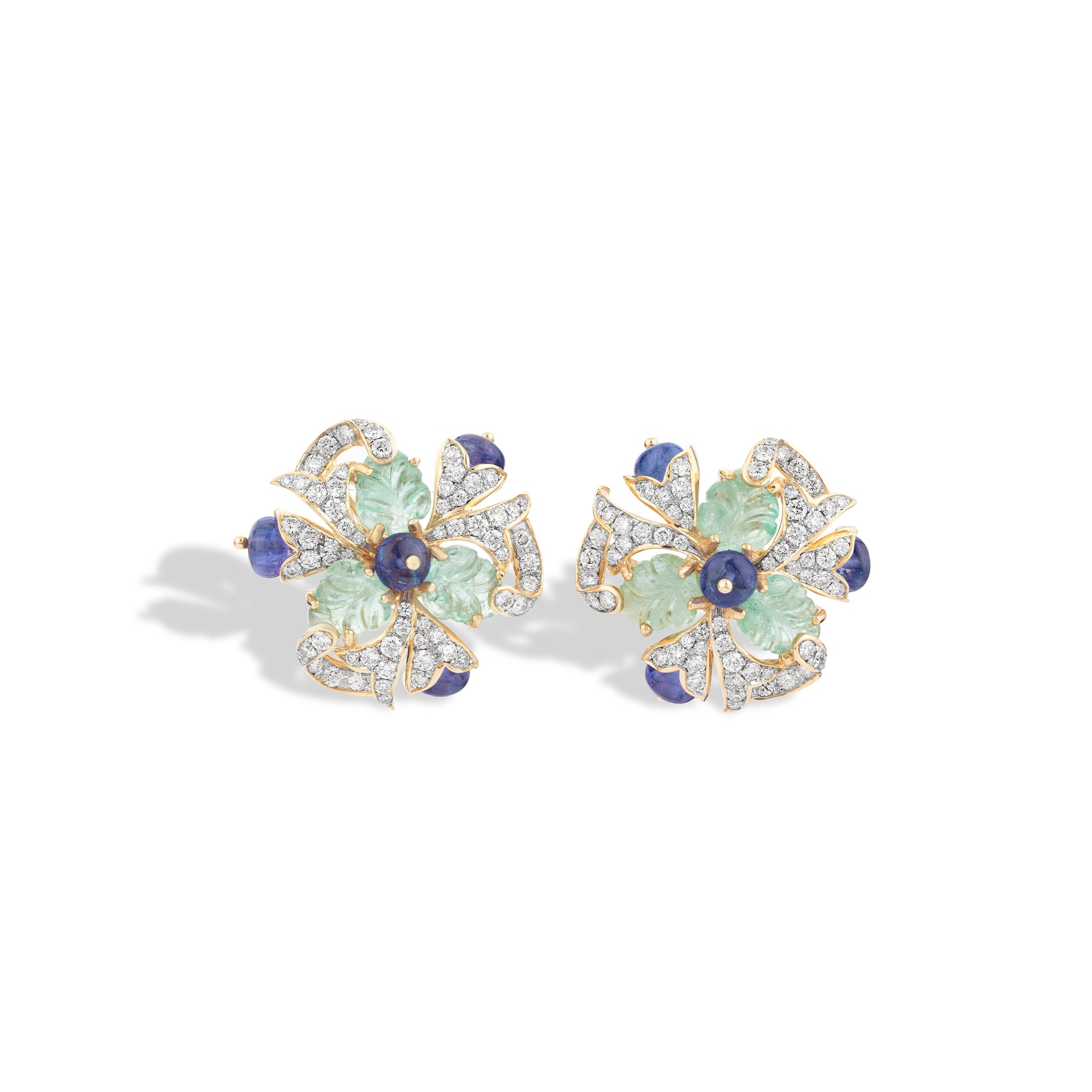 The Royal Courtyard Bloom Earrings embody the splendour of Mughal artistry, inspired by the jeweled courtyards and moonlit gardens of royal palaces. Crafted in 18KT gold, they feature vivid emerald petals and rich tanzanites accented with natural diamonds, reflecting the intricate craftsmanship of regal inlay work. Elegant and opulent, these earrings are a tribute to heritage and refinement — a timeless expression of beauty, grace, and royal sophistication.