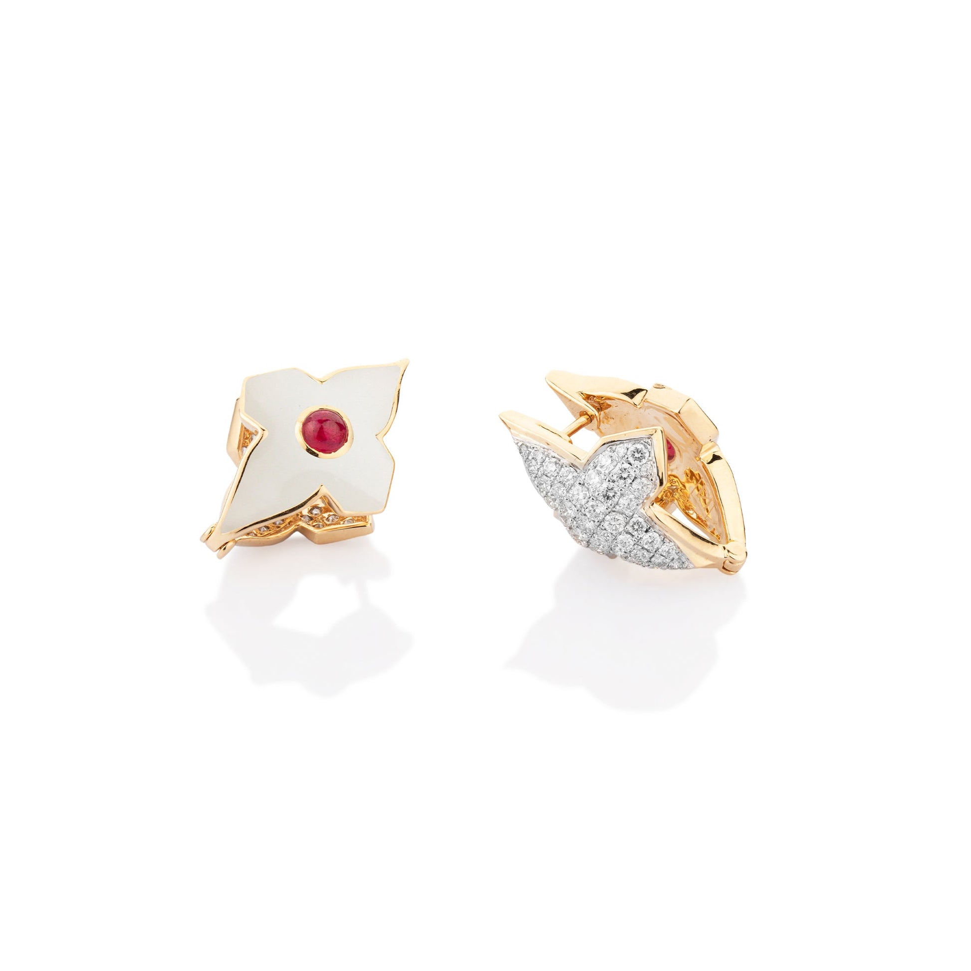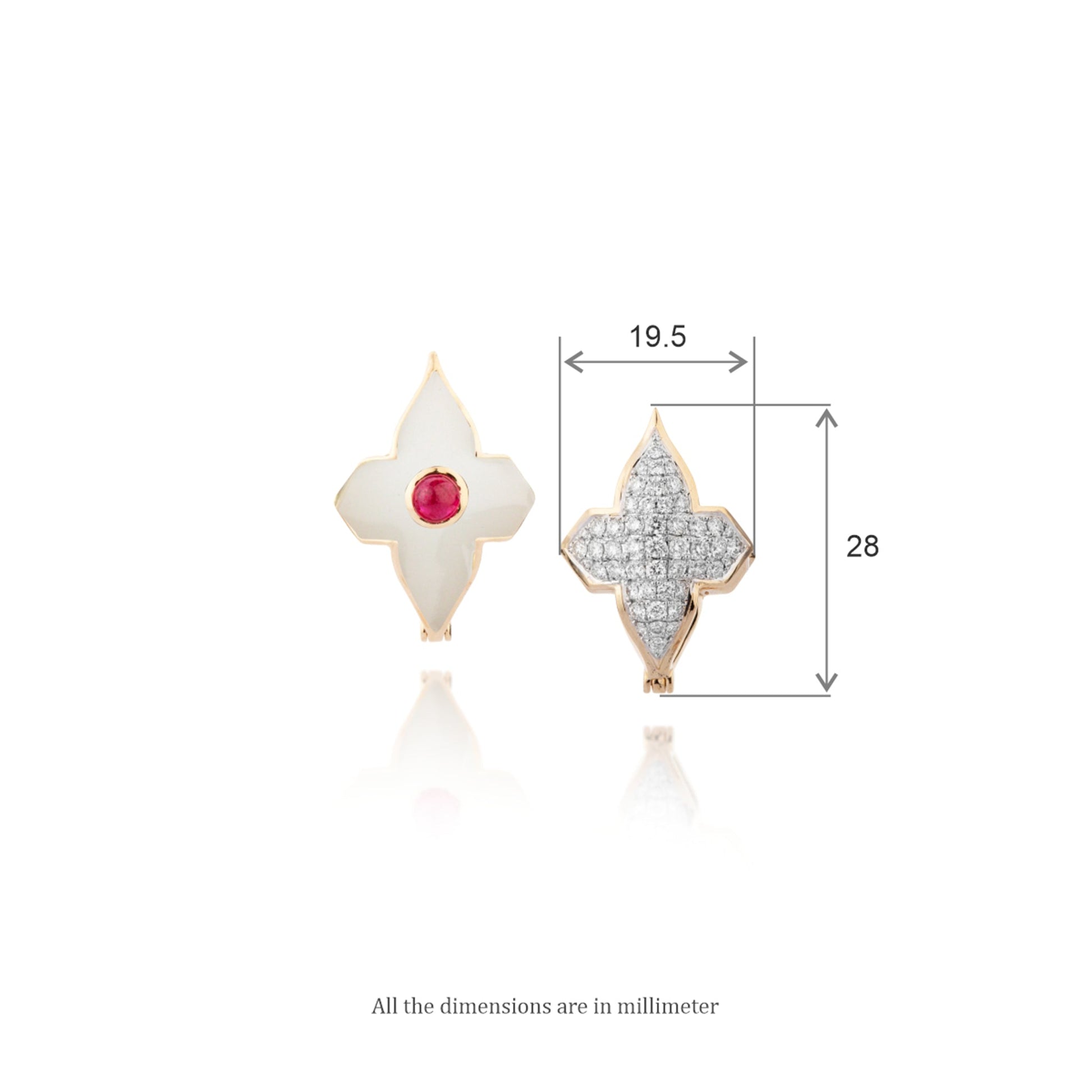 Add a sprinkle of sparkle and quirk to your everyday wear with our mismatch Aayat earrings designed in 18kt gold, natural ruby, brilliant diamonds and white ceramic. Style it according to your mood and add a delightful twist to your look.