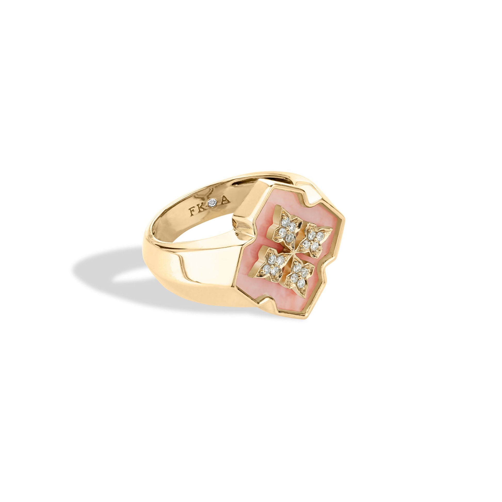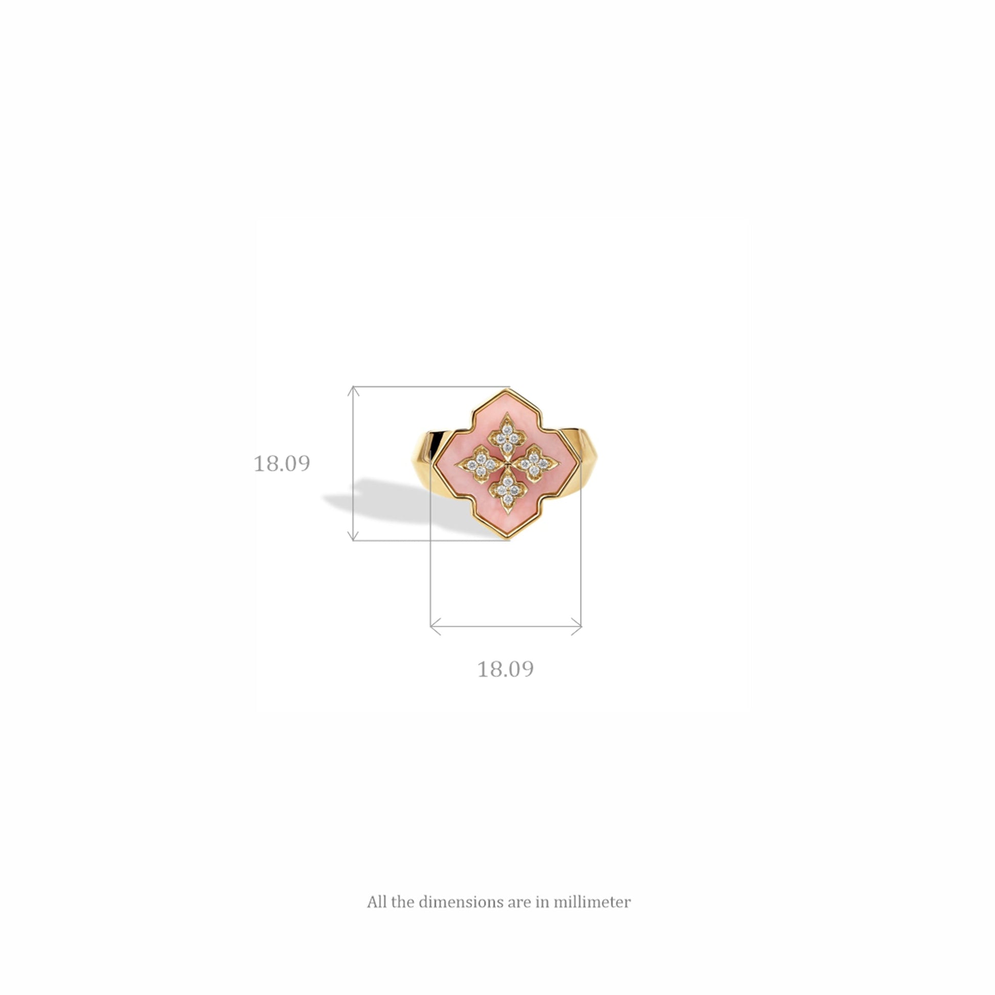 The Sacred Bloom Ring captures the essence of renewal and growth, inspired by the gentle transitions of nature. Crafted from Pink Opal, it symbolizes the spirit of bloom—soft, delicate, and full of potential. Set in 18K gold and adorned with natural diamonds, this ring is a reminder of new beginnings, perfect for the woman who embraces transformation and celebrates the beauty in every moment of change.