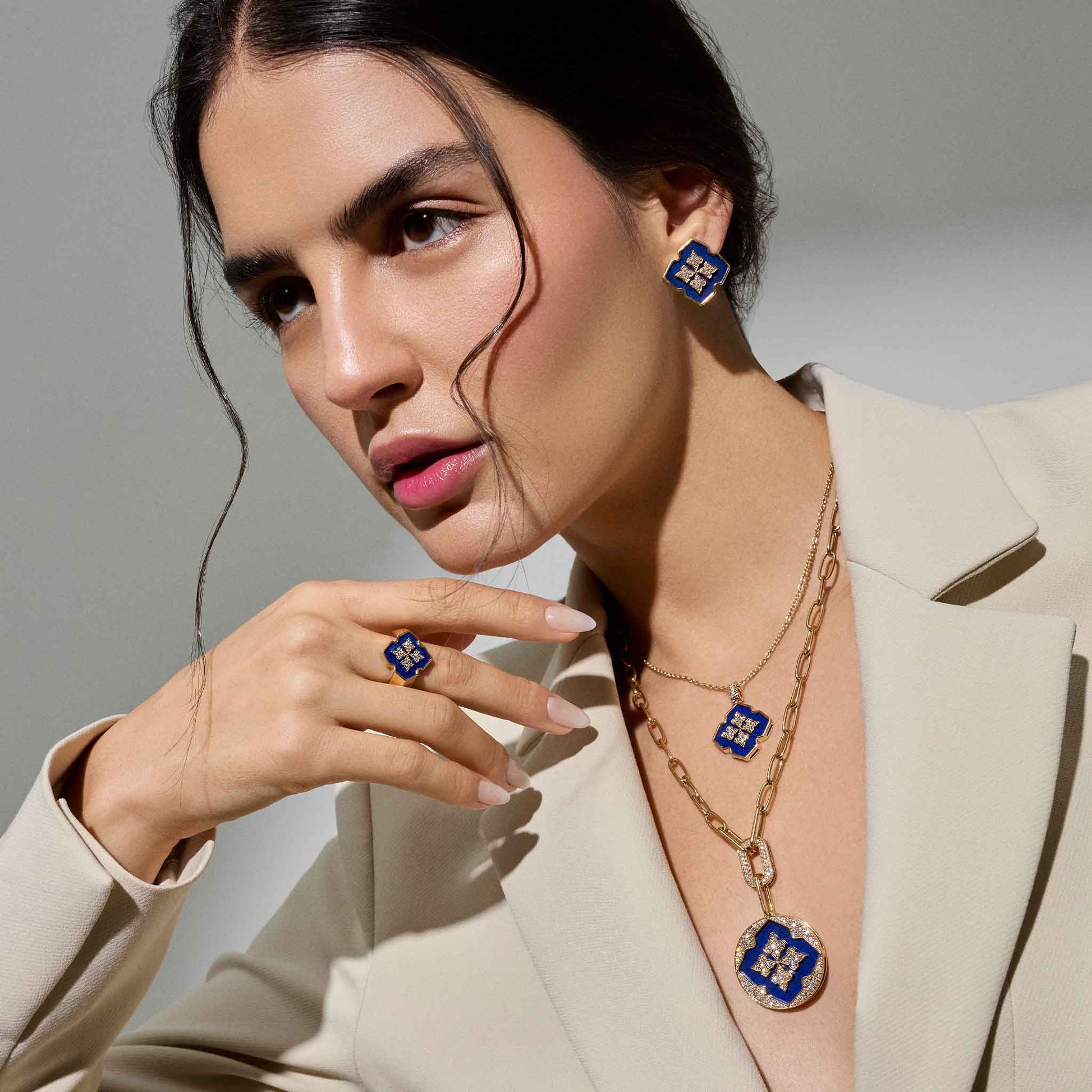 Sacred Blue Ring draws from the serene depths of water and the majestic allure of Lapis Lazuli. Crafted in 18K gold and illuminated with natural diamonds, it evokes a quiet strength and deep intuition. A symbol of clarity and calm, this ring is for the woman who honors her inner truth and walks her journey with unwavering grace.