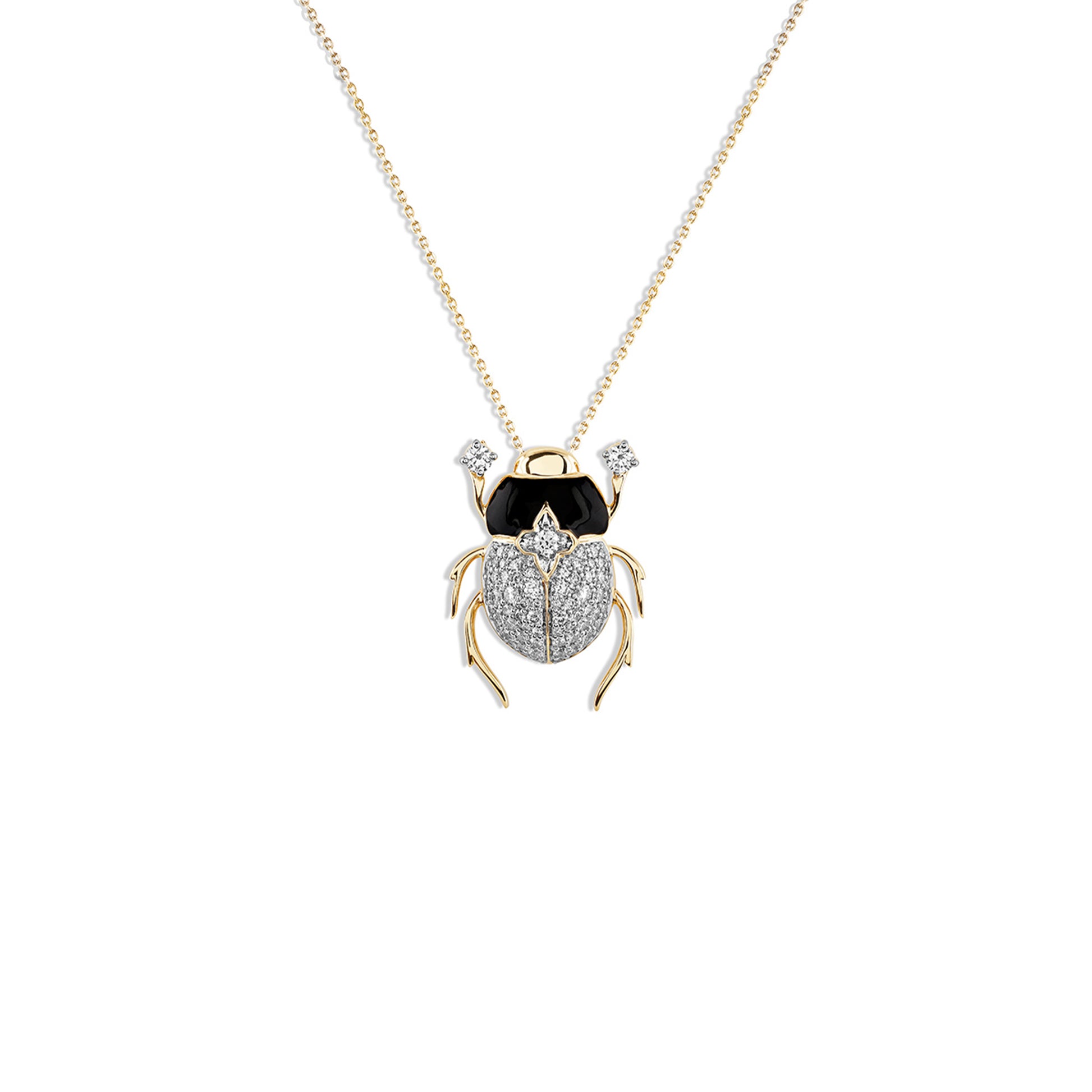 A fusion of mystery and brilliance, the Scarab Crystal Shield Pendant is sculpted in deep black ceramic and lit with a protective shimmer of natural diamonds. Framed in 18kt gold, this pendant is your personal armour of clarity — strong, striking, and soul-bound.