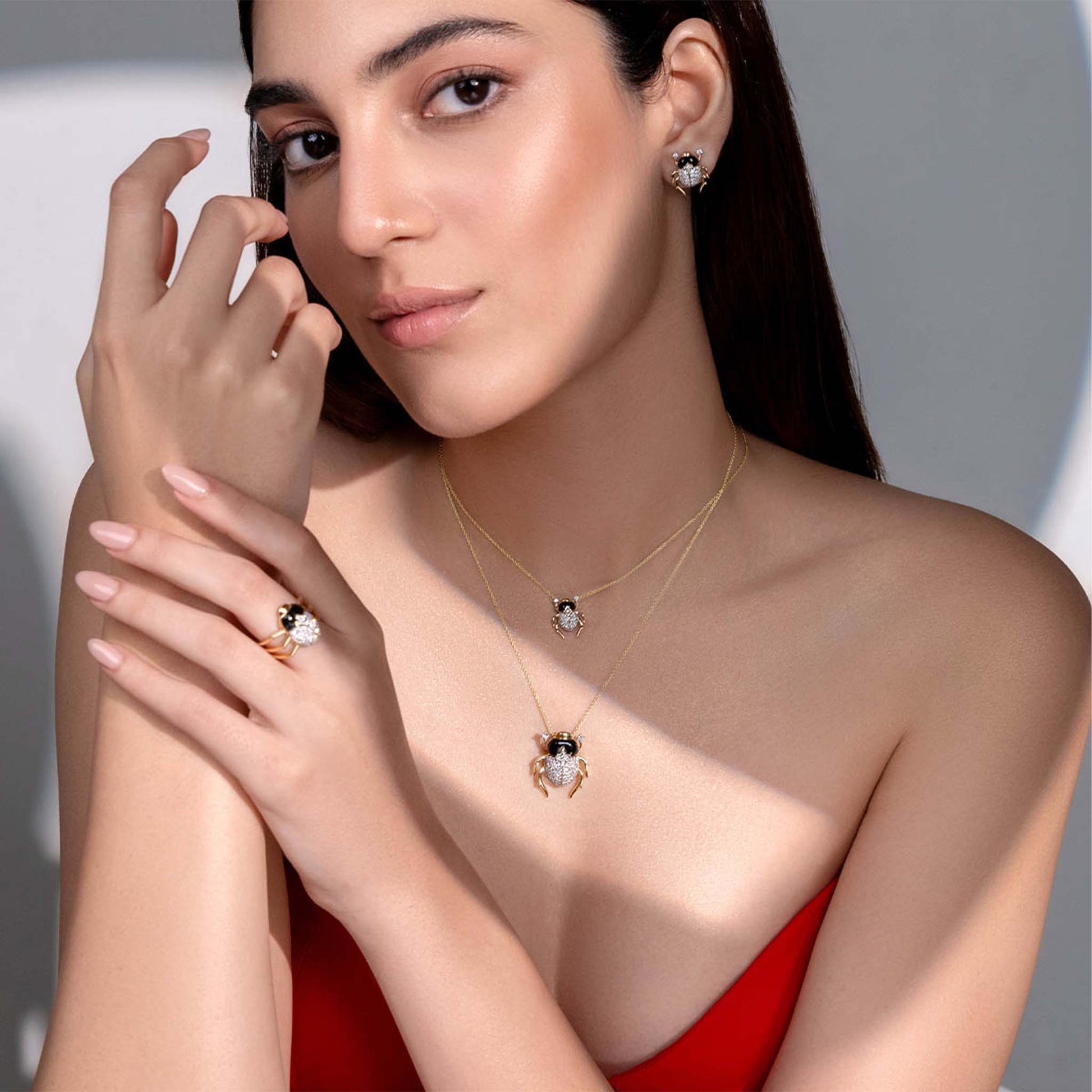 Designed for bold grace, the Scarab Starborn Earrings blend black ceramic with glints of diamond. Wrapped in 18kt gold, they carry the scarab’s mystique — fierce, transformative, and full of light.
