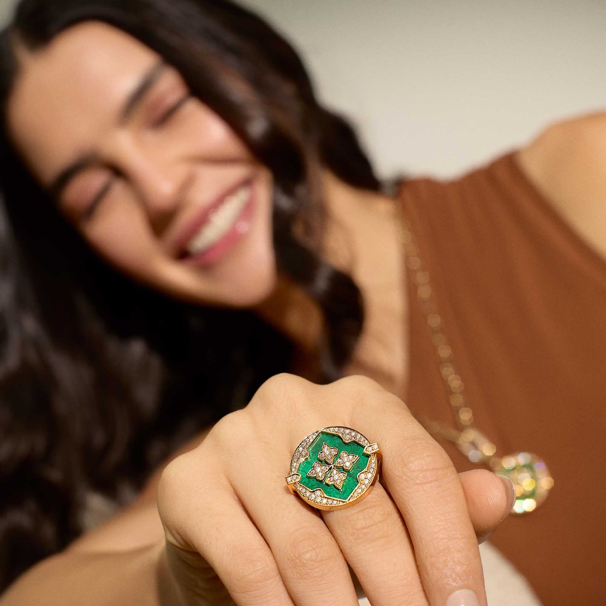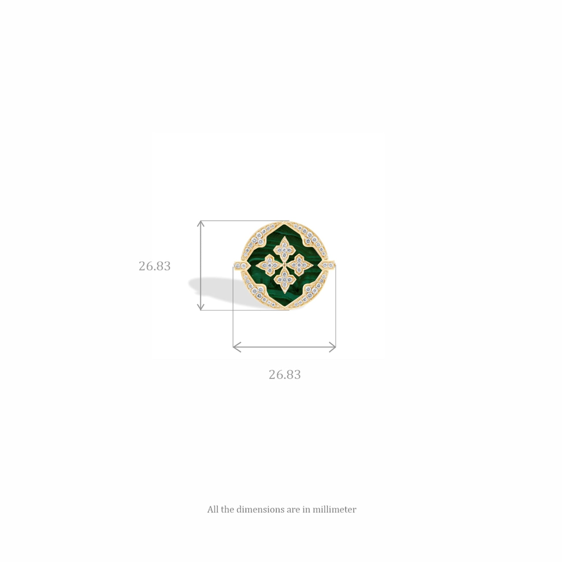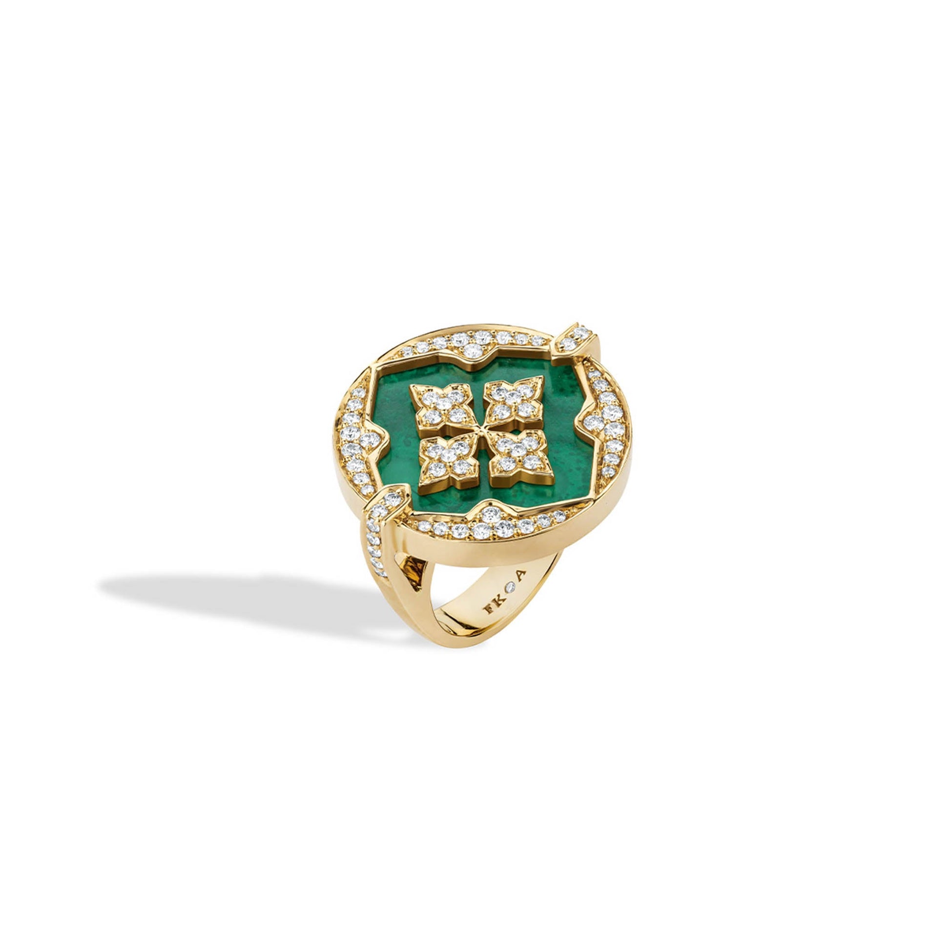 The Gaia’s Circle Ring reflects the steady heartbeat of the Earth through the rich green swirls of Malachite. Encased in 18K gold and adorned with natural diamonds, it is a timeless loop of power and presence—for the woman who is grounded, enduring, and deeply connected to nature.