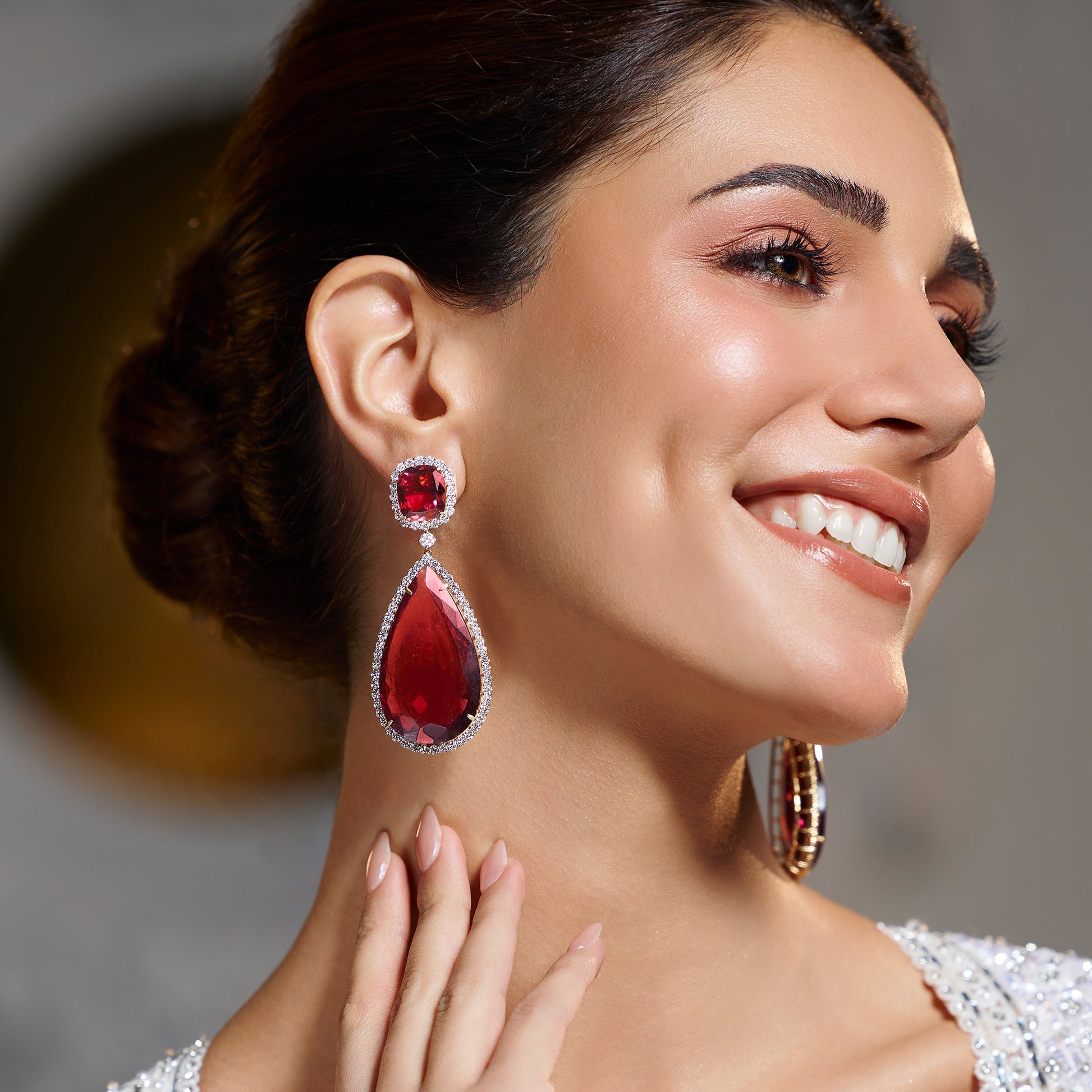 The Rubellite Hour Earrings celebrate strength, focus, and radiant energy. Crafted in 18KT gold, they feature rare 166-carat rubellite teardrops surrounded by a halo of natural diamonds, capturing light and movement with every turn. Bold and empowering, these earrings honor the woman who creates her own brilliance and shines with effortless confidence.