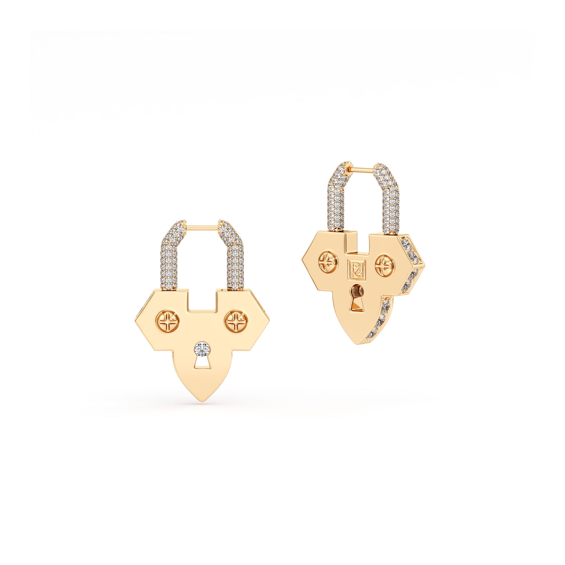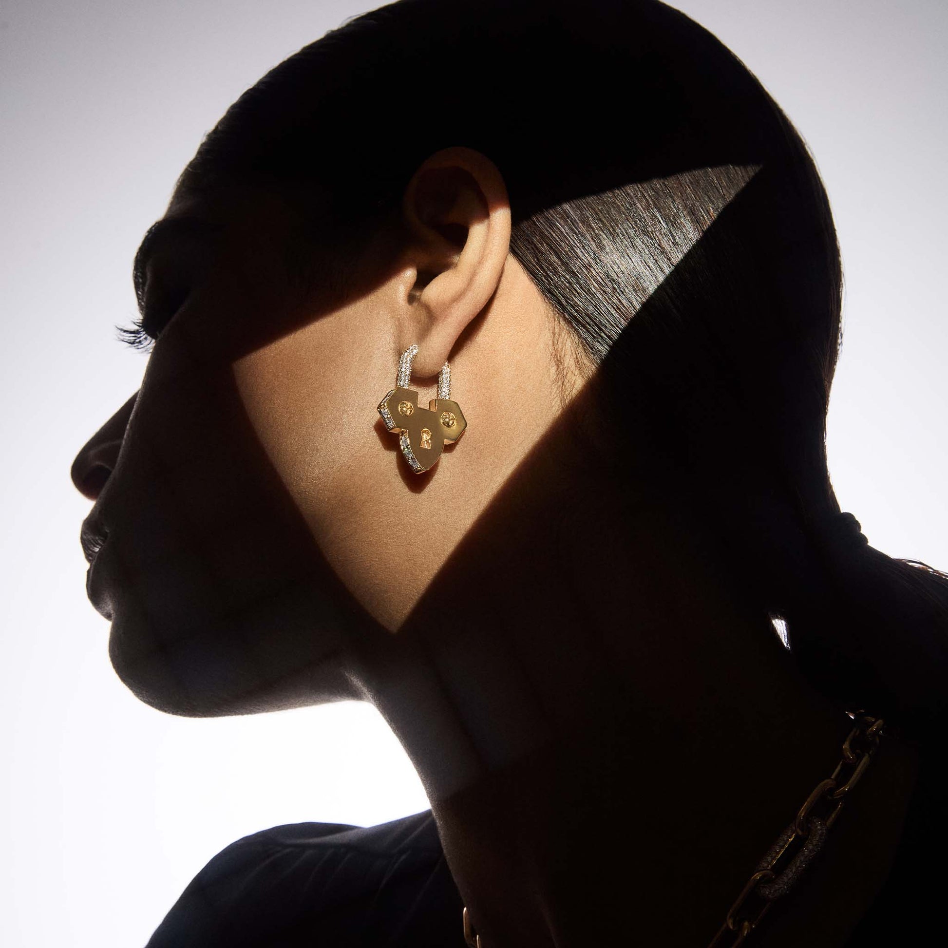Guardians of grace and enigma, the Secret Vault Earrings shimmer in 18kt gold and diamonds. Their sleek padlock form holds stories untold, making them a quiet statement of confidence — because mystery, when worn, becomes power.