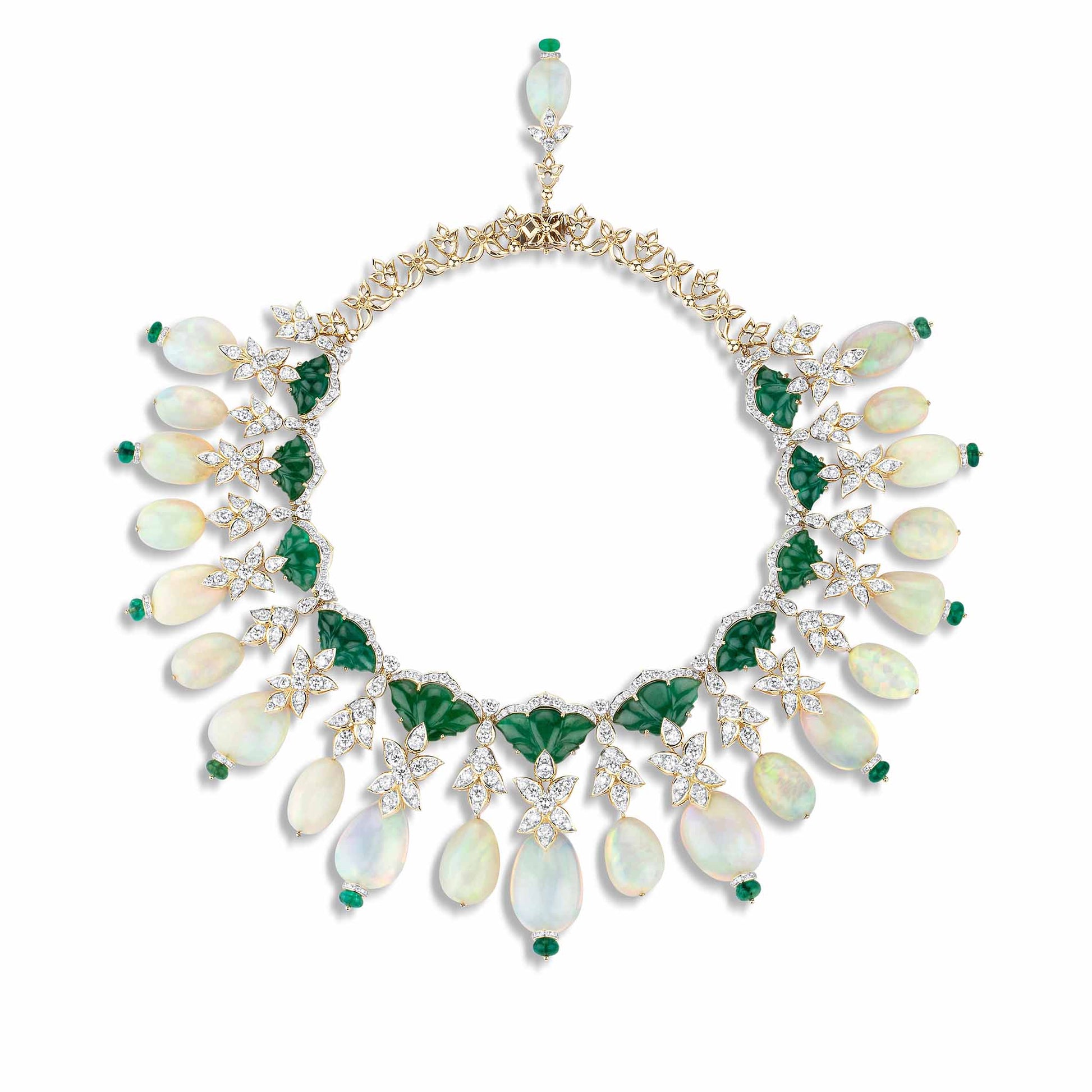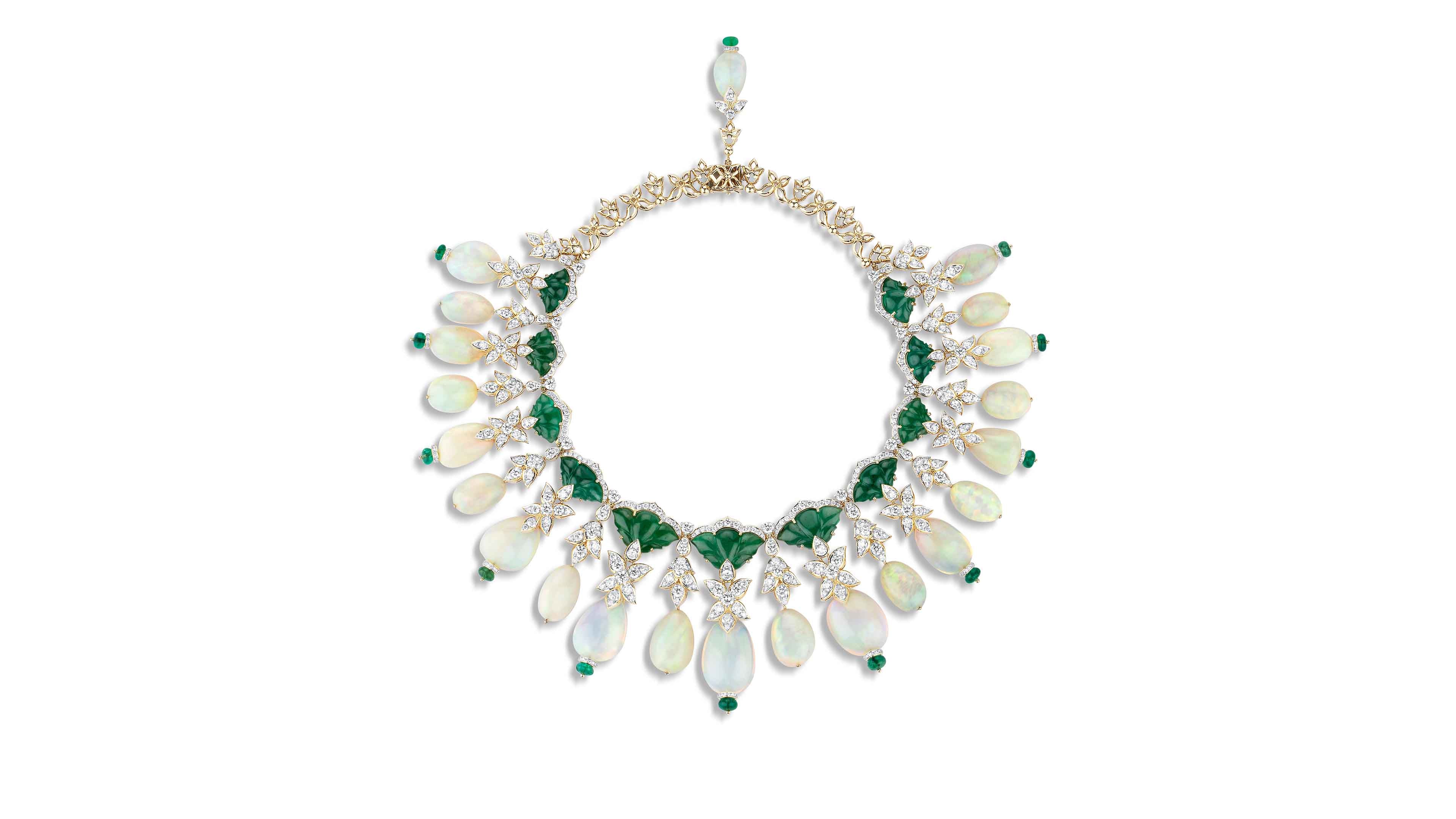 Crafted in 18kt gold, the necklace and earrings feature carved emeralds, natural diamonds, and iridescent opals — each chosen to reflect nature’s quiet strength and fluid elegance.