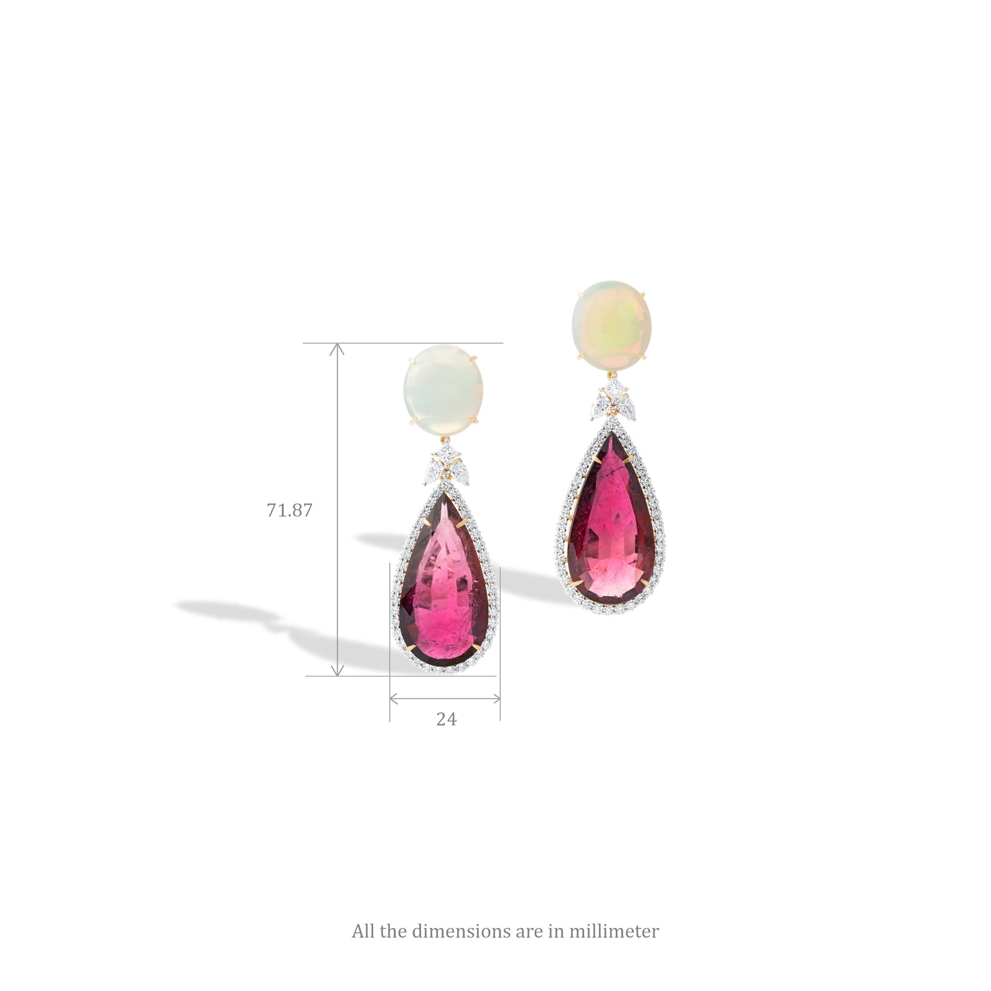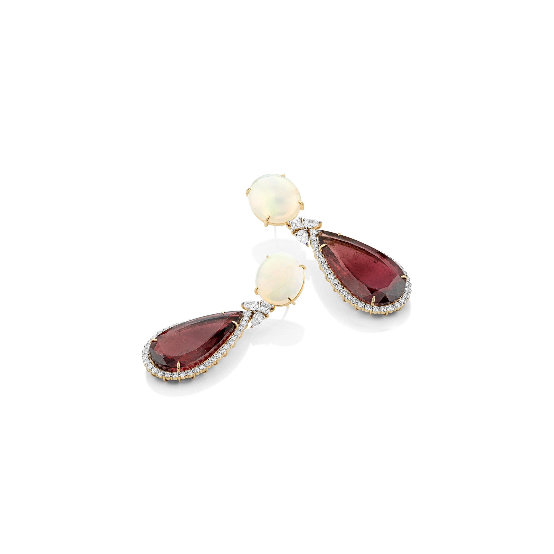 The Whispers of Dawn Earrings capture the serene beauty of early morning light. Crafted in 18KT gold, they feature luminous white opals paired with deep 85-carat rubellites, reflecting both softness and quiet intensity. Elegant and striking, these earrings celebrate serenity, strength, and the radiant presence of a woman who brings her own light.