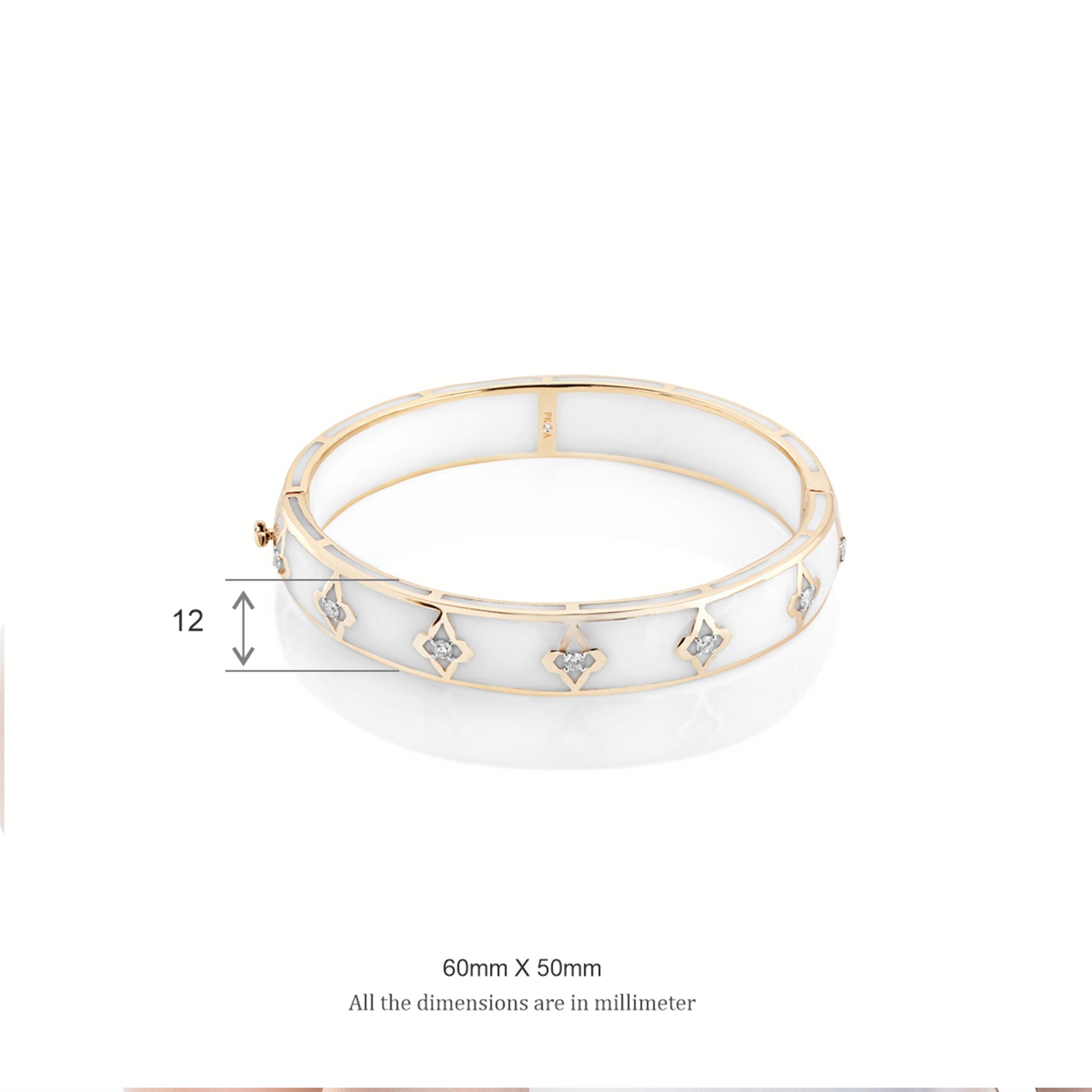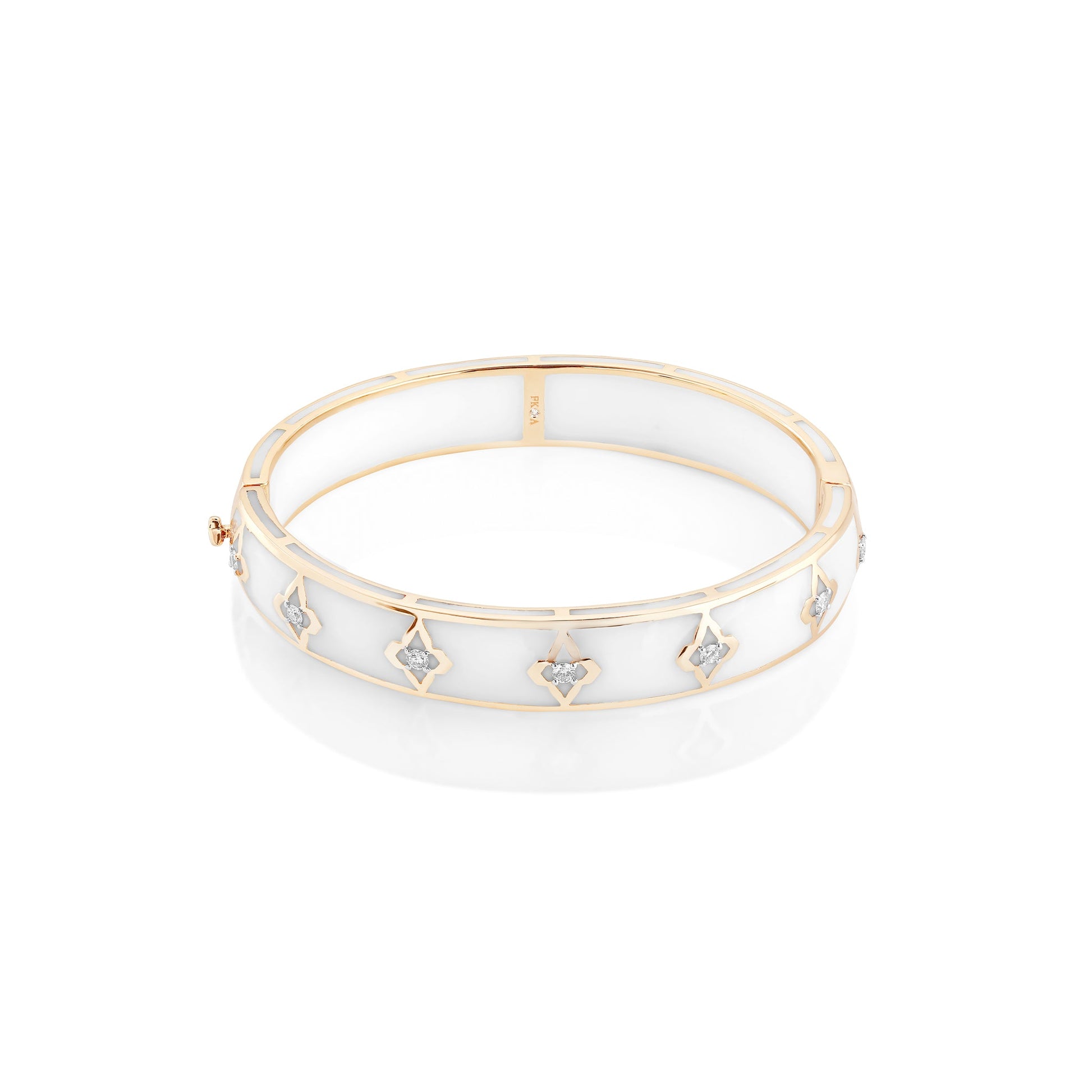This monochromatic and intricately crafted Aayat oval bangle makes a sparkling statement for the personality of a strong yet fragile woman. It is designed in 18kt gold, brilliant diamonds and white ceramic.