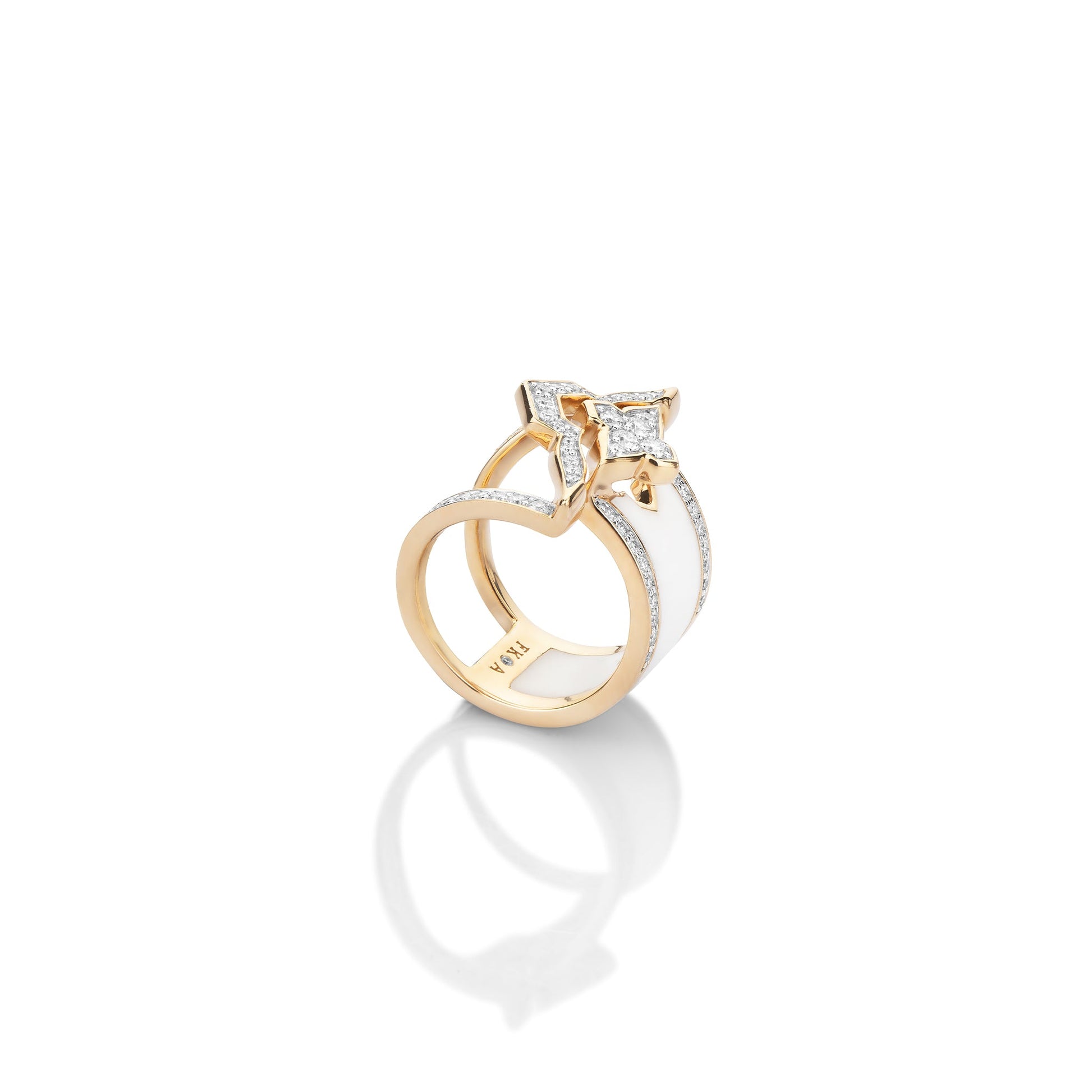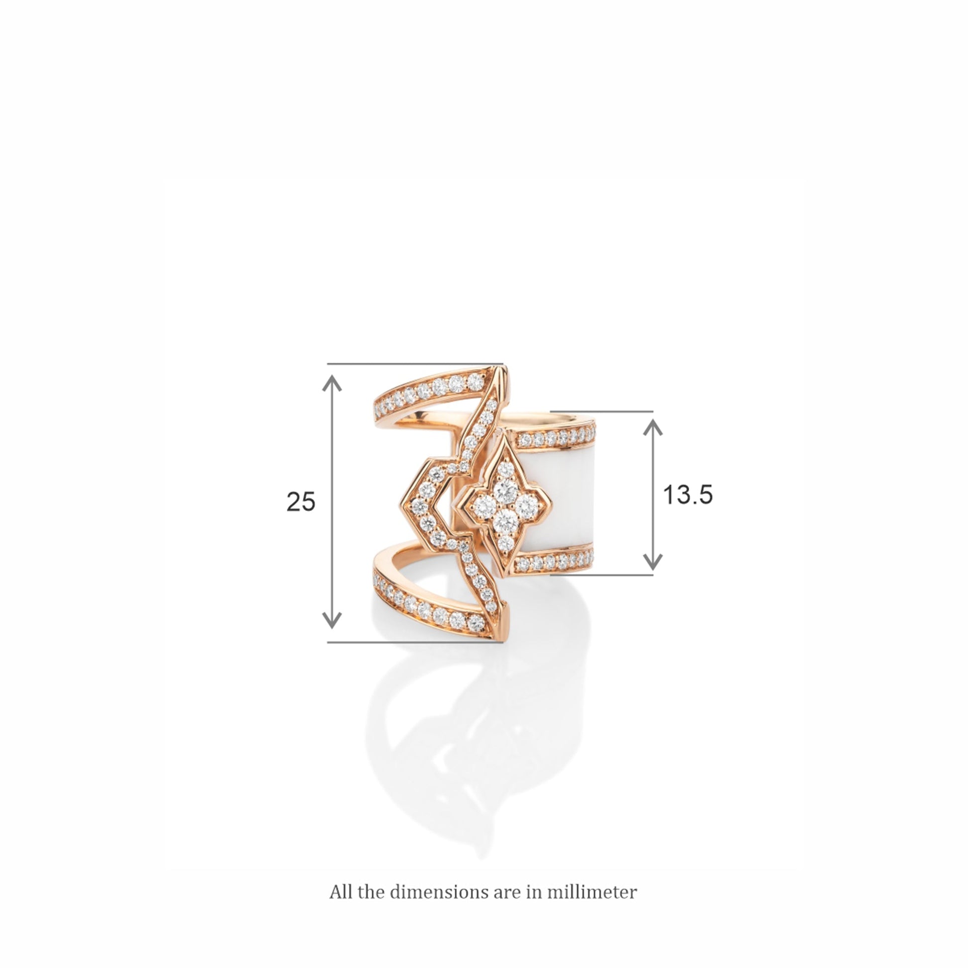 This monochromatic and intricately crafted Aayat ring makes a sparkling statement for the personality of a strong yet fragile woman. This bold ring is designed in 18kt gold, brilliant diamonds and white ceramic.